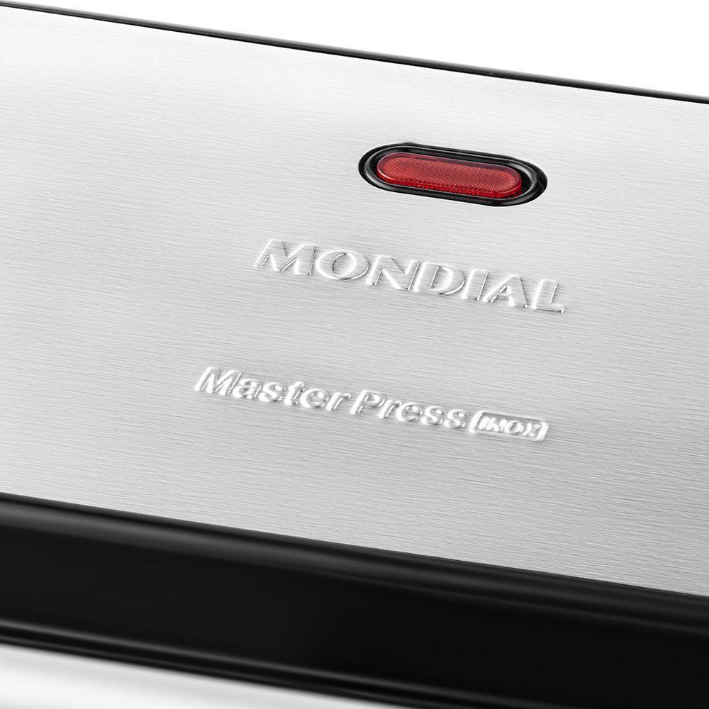Sanduicheira E Grill Mondial Press Antiaderente Preto/inox 220 VMantenha o sabor irresistivel das suas receitas de forma mais saudavel e pratica com a Master Press Inox da Mondial. Fique a vontade para preparar sanduiches e grelhados no grill 2 em 1. Suas 2 chapas ajustaveis e antiaderentes facilitam o preparo de alimentos de diferentes tamanhos e dos dois lados.2 em 1: Grill e sanduicheira, mais praticidade durante o preparo de grelhados, peixes, sanduiches e vegetaisGrelhas antiaderentes: Excelente grelha antiaderente, aquece rapidamenteCaracteristicas:Alimentacao Saudavel: Permite prepara as suas receitas sem oleoComprimento do cabo: 1,50mBandeja coletora: NaoLuz indicadora: SimControle de temperatura: NaoTipo de preparo: Paes, vegetais, carnes, grelhados e outros alimentos.Tipo de tomada: 10ATipo de Chapa: Dupla antiaderente e ajustaveisGuarda fio: NaoAlimentacao: Energia EletricaAntiaderente: SimPotencia: 1000WDimensoes:Altura: 7,8 cmLargura: 27,1 cmProfundidade: 21,7 cmPeso: 1,1 kgGarantia: 12 meses