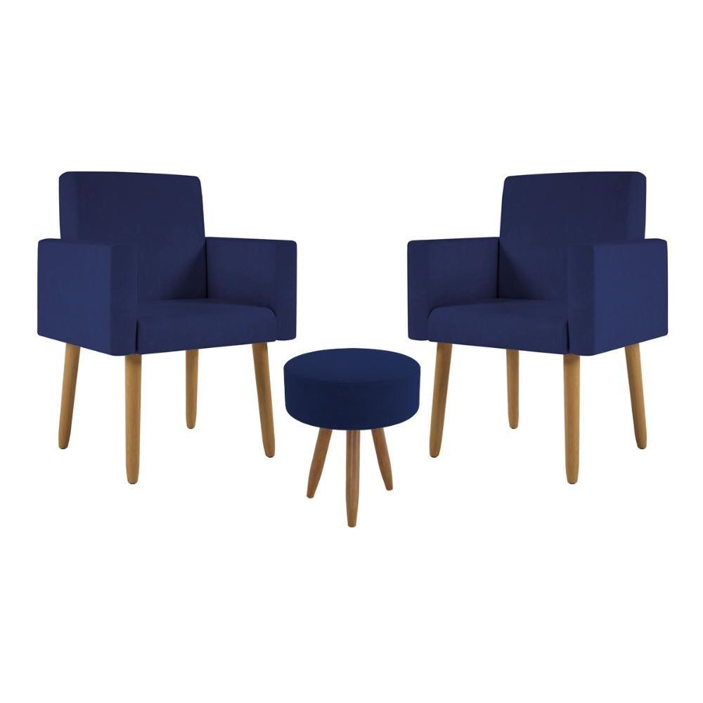 Kit 2 Poltronas Cadeira Recepção Nina Com Puff Balaqui Decor Azul Marinho