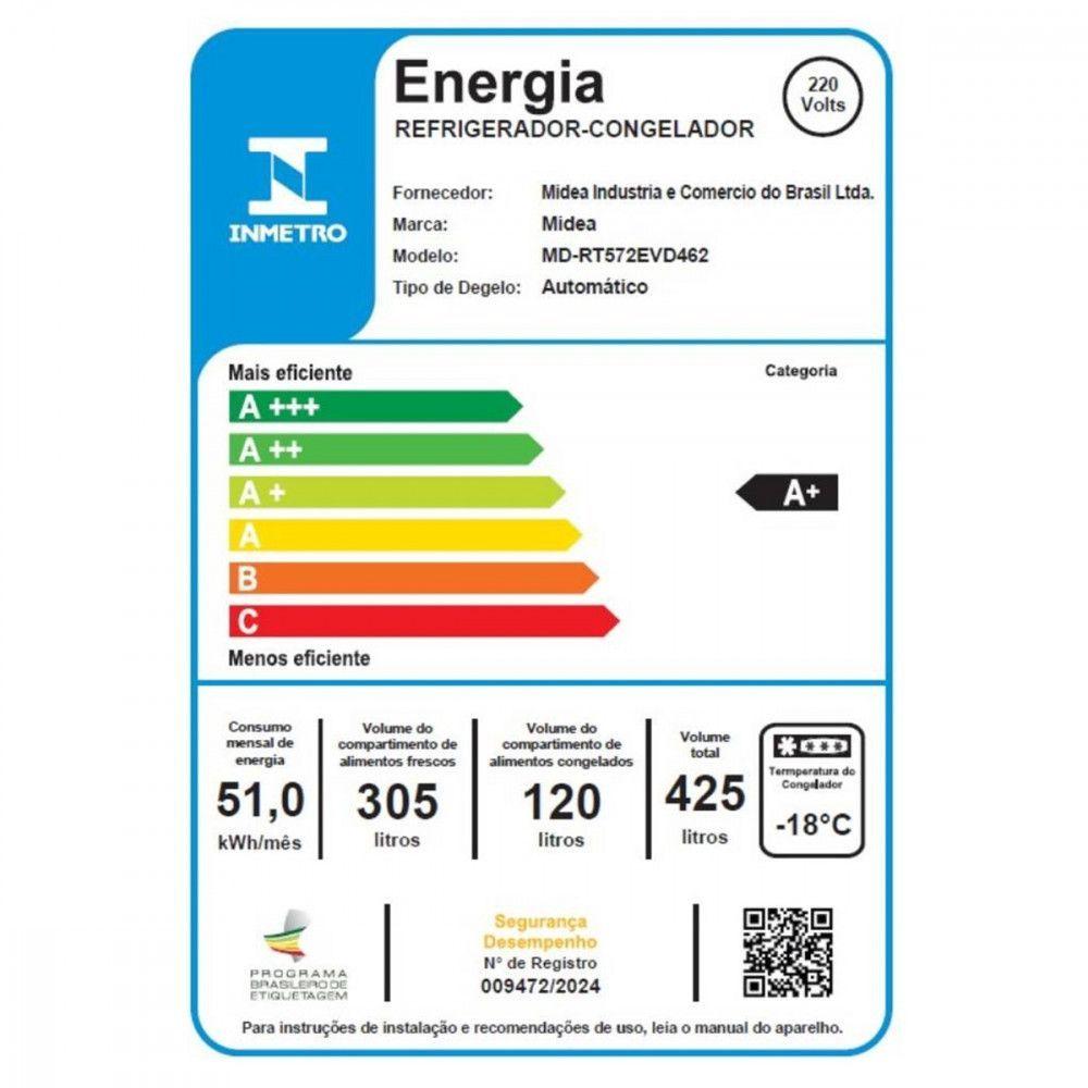 Refrigerador Midea MD-RT572EVD461 425L Inox 110VGeladeira Midea Frost Free Duplex 425L com Painel Touch - InoxA nova Geladeira Midea Frost Free Duplex de 425 litros vai te surpreender! Ela é moderna, espaçosa e conta com o maior freezer da categoria, com 120 litros de capacidade. Além de ser econômica, com classificação A+ no INMETRO, possui painel touch e um design sofisticado que vai transformar a sua cozinha.Principais Características:Maior Freezer da Categoria (120L): Tenha muito mais espaço para organizar seus congelados. O freezer espaçoso é ideal para armazenar tudo o que você precisa sem malabarismos.Painel Touch Externo com Função Turbo: Controle a temperatura e acione a função Turbo Freezer com um simples toque no painel externo, sem precisar abrir a porta e gastar energia.Organização Interna Inteligente: Conta com um compartimento extra frio ideal para frios e bebidas, uma gaveta hortifruti para preservar frutas e legumes, e prateleiras de vidro resistentes e fáceis de limpar.Alta Eficiência Energética (Classe A+): Garante um baixo consumo de energia, ajudando a economizar na sua conta de luz, com a qualidade de um produto com Selo Procel. no Compressor: Tenha mais tranquilidade e confiança com a garantia de 10 anos no compressor, além da garantia de 1 ano para o produto.Especificações Técnicas:Marca: MideaModelo: MD-RT572EVD461Voltagem: 110V EAN: 7908198000850 (110V) Tipo: Geladeira Duplex Frost FreeCapacidade Total: 425 LitrosCapacidade do Refrigerador: 305 LitrosCapacidade do Freezer: 120 LitrosEficiência Energética: A+Consumo: 49,6 kWh/mêsCor: InoxPeso: 57 kgDimensões [AxLxP]: 185 x 59 x 71 cmGarantia: 12 meses (10 anos no compressor).