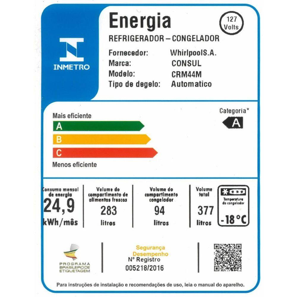 Geladeira Frost Free 377 Litros Tecnologia Inverter Função Turbo Branco 110VA Geladeira Consul Frost Free de 377 litros conta com Tecnologia Inverter e garante a sua conta de luz mais barata, a compra do mes durando mais, e uma cozinha mais silenciosa.A tecnologia Inverter te ajuda a economizar ate 38 porcento de energia. E a Consul garantindo sua conta de luz mais barata, a compra do mes durando mais, e uma cozinha mais silenciosaUm freezer do tamanho que voce precisa: chega de malabarismo para organizar seus congelados.Organize suas compras de forma facil! Com as prateleiras ajustaveis em ate quatro niveis, tudo o que voce precisa cabe sem problemas na sua geladeira, da melancia inteira a garrafa de 2L.Esta precisando gelar rapido, e pra ja. Essa funcao acelera[2] o resfriamento da geladeira, mesmo quando esta cheia.Espaco reservado para guardar alimentos frescos que precisam de maior refrigeracao e cuidado, como frios e laticinios.Geladeira bem pensada e bem iluminada, com luz de LED economica[3] que ajuda a visualizar tudo que tem dentro de um jeito facil e rapido.Deixe os seus alimentos frescos e delicados bem-organizados e faceis de encontrar.Mais espaco para congelar mais alimentos. Formas de gelo ocupando espaco.Espaco para armazenar ate 12 ovos, mantendo a organizacao da sua geladeira.Caracteristica:Peso do produto em Kg: 60Capacidade: 377LConsumo: 24,9 kW/ anoFrequencia: 60 HzPainel de controle: Nao AplicaConteudo da Embalagem: 01 Geladeira Frost Free Tecnologia Inverter Funcao Turbo 377 Litros ConsulDimensoes Do Produto:Altura: 183,4 cmLargura: 62,1 cmProfundidade: 72,4 cmGarantia Do Fornecedor: 12 Meses