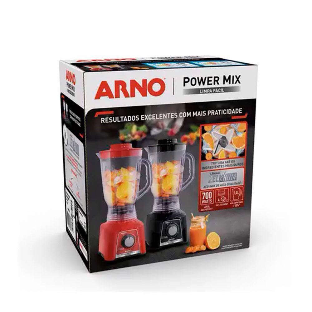 Liquidificador Arno Power Mix Limpa Fácil Lq33 700w Preto 220v Preto 220vLiquidificador Arno LQ33 Power Mix 700W Preto 220VTenha mais desempenho e durabilidade em sua cozinha! O Liquidificador Power Mix da Arno conta com uma tecnologia patenteada: as exclusivas laminas Zelkrom - aco inox de alta qualidade - que garantem ultra resistencia e durabilidade. Enriquecidas com cromo, as laminas nao mancham e nao enferrujam, alem de processar diversos cortes sem perder sua afiacao. O Liquidificador Power Mix da Arno tem alto poder de corte e tritura ate os ingredientes mais duro. Sao duas velocidades e funcao pulsar - autolimpeza com 700W de potencia. Conta tambem com jarra de polipropileno com 1,4L de capacidade total, porta fio e cabo de 80cm. Experimente resultados incriveis com o Liquidificador Power Mix da Arno.Caracteristicas:Marca: ArnoModelo: LQ33Capacidade Total: 1,4 LitrosPotencia: 700WNumero de Velocidades: 15Tipo de Material: Corpo em Plastico e Copo SAN CristalComprimento do Cabo: 0,8cmPorta Fios: SimConteudo da Embalagem: 01 Liquidificador e 01 Manual de InstrucoesDimensoes:Altura: 29,1 cmLargura: 26,1 cmProfundidade: 16,9 cmPeso: 1,235 kgGarantia do Fabricante: 12 meses