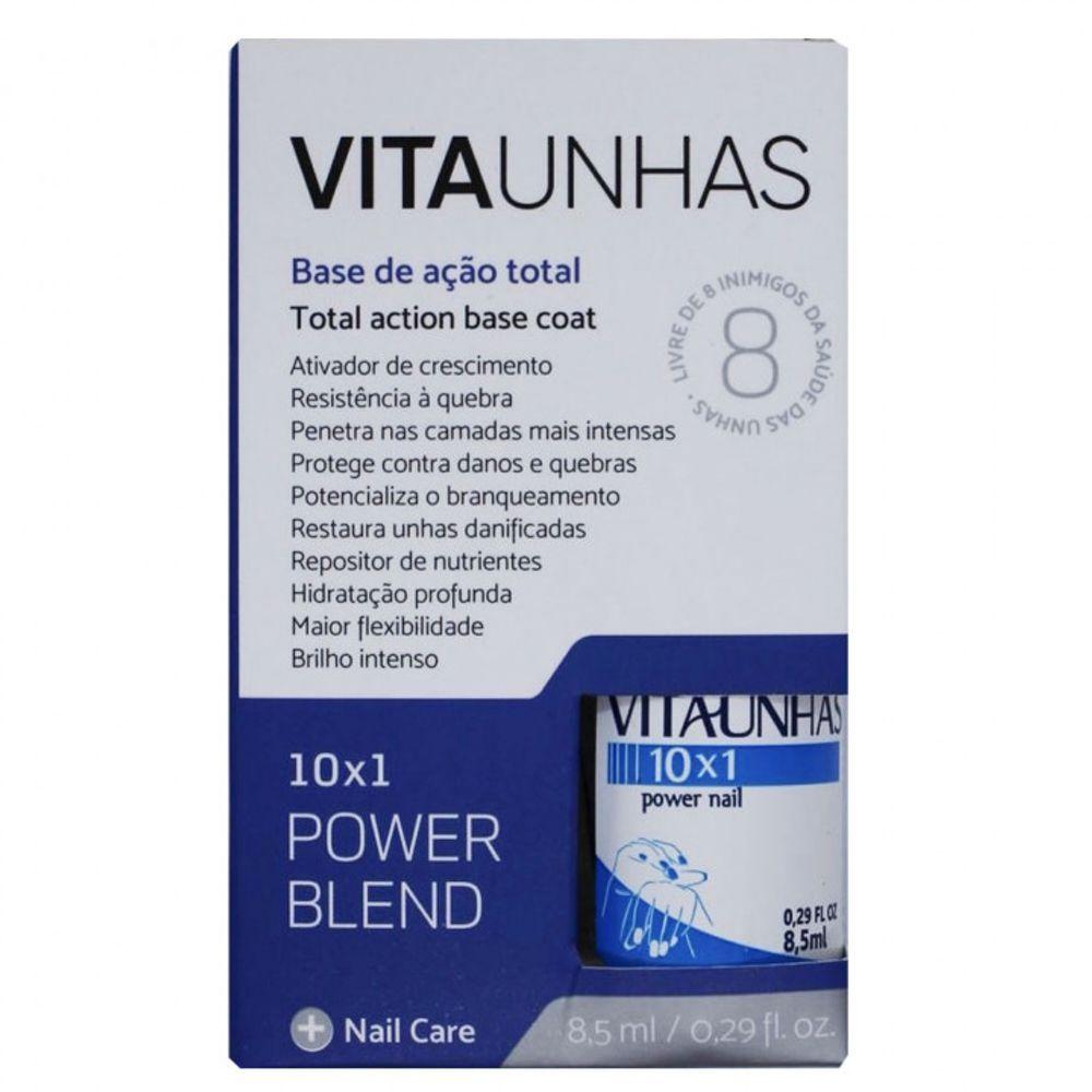 Base De Ação Total Vitaunhas Power Blend 8,5mlBase de Ação Total Vitaunhas Power Blend 8,5mlBase Powel Nail 10x1 foi desenvolvido com o intuito de ser uma base de ação total, para agir desde a raiz e camadas mais profundas das unhas até a superfície através de 10 ativos direcionados para a recuperação e nutrição completa das unhas.Ativador de crescimento. Promove resistência à quebra. Penetra até nas camadas mas internas. Protege contra danos e fraturas. Reconstrói unhas danificadas. Pontencializa o branquiamento. Repositor de nutrientes. Hidratação profunda.Maior flexibilidade. Brilho intenso.