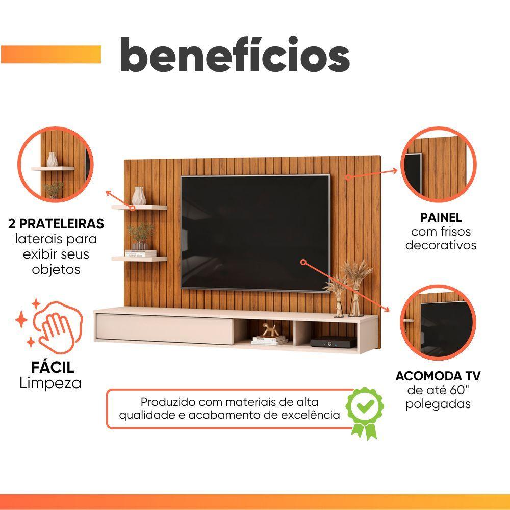 Painel Para Até 60 Polegadas Frisado Com Nichos Icaro Madeirado/off White Madeirado/off WhiteTransforme seu espaço com o Painel Icaro para até 60 Polegadas frisado autêntico contemporâneo. Este painel traz um design moderno e elegante, que une estilo e durabilidade. Com 2 prateleiras funcionais e 4 nichos para maior armazenamento e uma porta deslizante, ele oferece praticidade e organização para seus itens, agregando sofisticação ao ambiente e o suporte ideal para sua . Ideal para quem busca beleza, funcionalidade e qualidade em um único produto.MEDIDAS PAINEL:A = 108 cmL = 179 cmP = 29 cmMEDIDAS NICHOS:A = 15 cmL = 42,4 cmP = 26,4 cmMEDIDAS PRATELEIRAS:L = 29,6 CMP = 14,5 CMPESO SUPORTADO: 40 kgPESO: 32,85 kgNICHOS SUPORTAM ATÉ: 2 kgPRATELEIRAS SUPORTAM ATÉ: 2 kgIDEAL PARA DE ATÉ: 60 PolegadasMODELO: Painel Para Até 60 Polegadas Frisado Com Nichos Icaro Madeirado/Off WhiteMARCA: DJ MóveisCOR: Madeirado/Off WhitePINTURA: UV de alta qualidadeACABAMENTO: MelaminaMATERIAL: MDP/MDFESPESSURA DO MATERIAL DA ESTRUTURA: 12 mm e 15 mmPRATELEIRAS: 2NICHO: 4PORTAS: 1TIPO DE PORTA: DeslizanteESPAÇO PARA PASSAR FIOS: SimDIFERENCIAL: Acabamento pintura UV de alta qualidade / Detalhe frisado autentico / Prateleiras funcionais / Nichos para maior armazenamento / Porta deslizante / Para ’s até 60 Polegadas.INSTRUÇÕES E CUIDADOS: Para maior durabilidade, recomendável que a limpeza dos móveis seja feita com pano limpo e seco. Não usar produtos químicos ou abrasivos.GARANTIA: 3 meses pelo fabricante.Importante sobre a : A é realizada até a portaria ou porta de entrada do indicado, desde que o acesso seja permitido. Para locais com portaria, a será feita no piso térreo. Não realizamos montagem, desmontagem, por escadas ou içamento. É responsabilidade do cliente verificar se as dimensões do produto são compatíveis com portas, elevadores e corredores. Evite imprevistos: confira todos os detalhes antes de concluir sua compra MEDIDAS PAINEL:: A = 108 cm L = 179 cm P = 29 cm | MEDIDAS NICHOS:: A = 15 cm L = 42,4 cm P = 26,4 cm | MEDIDAS PRATELEIRAS:: L = 29,6 CM P = 14,5 CM | PESO SUPORTADO:: 40 kg | PESO:: 32,85 kg | NICHOS SUPORTAM ATÉ:: 2 kg | PRATELEIRAS SUPORTAM ATÉ:: 2 kg | IDEAL PARA DE ATÉ:: 60 Polegadas | MODELO:: Painel Para Até 60 Polegadas Frisado Com Nichos Icaro Madeirado/Off White | MARCA:: DJ Móveis | COR:: Madeirado/Off White | PINTURA:: UV de alta qualidade | ACABAMENTO:: Melamina | MATERIAL:: MDP/MDF | ESPESSURA DO MATERIAL DA ESTRUTURA:: 12 mm e 15 mm | PRATELEIRAS:: 2 | NICHO:: 4 | PORTAS:: 1 | TIPO DE PORTA:: Deslizante | ESPAÇO PARA PASSAR FIOS:: Sim | DIFERENCIAL:: Acabamento pintura UV de alta qualidade / Detalhe frisado autentico / Prateleiras funcionais / Nichos para maior armazenamento / Porta deslizante / Para ’s até 60 Polegadas. | INSTRUÇÕES E CUIDADOS:: Para maior durabilidade, recomendável que a limpeza dos móveis seja feita com pano limpo e seco. Não usar produtos químicos ou abrasivos. | GARANTIA:: 3 meses pelo fabricante. | AVISO:: Importante sobre a : A é realizada até a portaria ou porta de entrada do indicado, desde que o acesso seja permitido. Para locais com portaria, a será feita no piso térreo. | Altura: 108 cm | Formato do móvel: Painel | Inclui manual de montagem: Sim | Largura: 179 cm | Profundidade: 29 cm | Quantidade de caixas de embalagem: 1 | Requer montagem: Sim | Altura da embalagem: 9 cm | Comprimento da embalagem: 180 cm | Largura da embalagem: 55 cm | Peso da embalagem: 35400 g | Tipo da embalagem: sem embalagem adicional | Cor: Madeirado/Off White