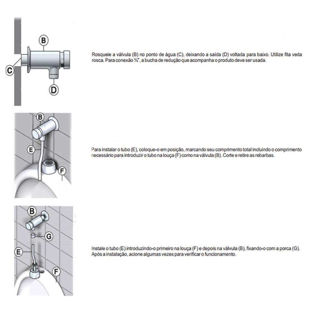 Válvula De Mictório Compact Pressmatic - CromadoVálvula de Mictório Compact PressMatic - Cromado - A válvula possui um acionamento hidromecânico, que garante o fechamento automático Uma ótima opção para ambientes públicos e de alta circulação de pessoas, já que é um produto que possui um acabamento cromado biníquel proporcionando ;durabilidade diante de corrosão e depredações e possui instalação com parafusos específicos que não podem ser acionados sem a chave de manutenção. ; Mais uma vantagem caso precise ser em um ambiente de grande circulação é o sistema tecnologia PressMat que possui um acionamento hidromecânico que garante o fechamento automático e sem vazão após 06 segundos de uso! ; Possui também um alto indice de durabilidade! ;Características Gerais do Produto:- Acabamento: Polido- Garantia: Garantia Todavida Docol- Marca: Docol- Material: Ligas de cobre, elastômeros, plástico de engenharia e aço inoxidável- Peso Líquido: 0,464Kg- Cor: CromadoAcompanha o produto:- 1 Cartucho1 Corpo1 Niple redução2 Canopla1 Anel retangular1 Porca1 Canopla com anel de acabamento1 Tubo curvo2 RestritoresManual de instalaçãoGarantia:- 3 MESES