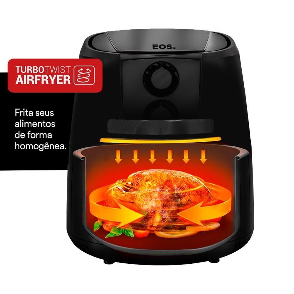 Fritadeira Sem óleo Air Fryer Chef Gourmet 4,2l Titanium Eaf42t 127v - Eos 127vMUITO IMPORTANTE:-- CONFERIR PRODUTOS NO ATO DO . NÃO ACEITAR PRODUTOS COM EMBALAGEM VIOLADA (, RASGADO, ABERTO, , ETC), A RECUSA DEVE SER FEITA NO ATO.Fritadeira Sem Óleo Airfryer Chef Gourmet 4,2L Titanium EAF42T 127V - EOSA air fryer EOS será sua aliada para preparar as refeições que você mais gosta de forma mais saudável.A air fryer EOS EAF42T permite que você cozinhe sem a necessidade de usar óleo.Detalhes do produto:- MUITO MAIS ESPAÇO: 4,2 litros para fazer suas receitas de de forma incrível;- TIMER: Você sempre tranquilo enquanto sua comida está sendo preparada;- MAIS PRÁTICA: Sistema Antiaderente MaxxiClean que facilita a limpeza e não gruda;- TERMOSTATO: Maior precisão ao selecionar a temperatura da sua air fryer;- PORTÁTIL: Leve e prático: possibilita levar para qualquer lugar facilmente;- DESIGN COMPACTO: Design pensado para ocupar pouco espaço, sem perder funcionalidades.Características:- Alta Capacidade interna: Cuba de 4,2L e Cesto de 3,5L- Mais prática: Sistema maxxiclean, com dupla camada antiaderente livre de PFOA (compostos químicos nocivos à saúde)- Maior velocidade: Exclusiva tecnologia twist fry- Melhor saúde: Frita sem utilizar óleo- : Com sistema de proteção para evitar a queda acidental do cesto interno- Ajustável: Com timer programável de até 30 minutos e temperatura ajustável de até 200°C- Timer com aviso sonoro de término do preparo de alimentosFicha Técnica:- Voltagem: 127V/60Hz;- Alimentação: elétrico;- Modelo: EAF42T;- Código Salvador Comercial: 014053;- Capacidade: 4,2L;- Classificação: Air Frier (fritadeira sem óleo);- Garantia: 12 meses;- Potência (W): 1500W;- Consumo: 1,5kW/h;- Timer programável: sim;Dimensões:- Bebedouro: 34 cm A x 35 cm L x 24 cm P;- Embalagem: 39 cm A x 33 cm L x 33 cm P;- Peso Líquido: 4,7kg.- Peso Bruto: 5,2kg.Perguntas frequentes:- Preciso adicionar algo na hora de fazer as alimentos, tipo óleo?Não é necessário, os alimentos são feitos através da exclusiva tecnologia twist fry.- O cesto possui aberturar para circulação de ar na lateral ou somente no fundo?Este modelo somente no Fundo. Voltagem: 127V Voltagem: 127V