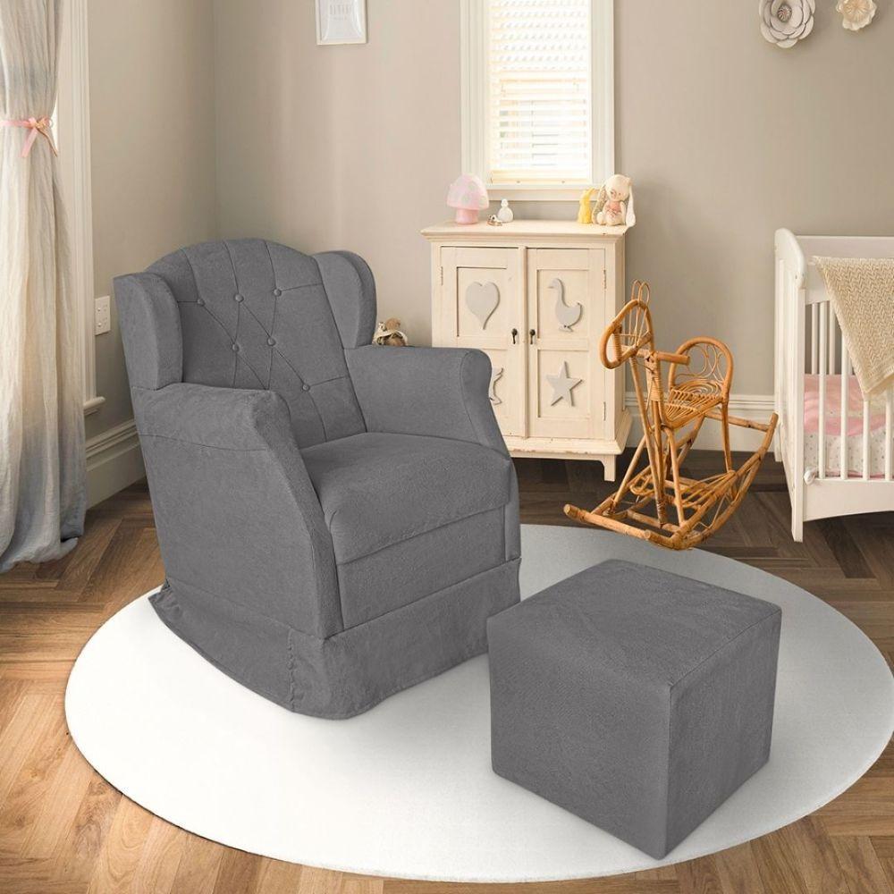 Poltrona Amamentação Com Balanço E Puff Luxo Suede Manuela Cor:cinza