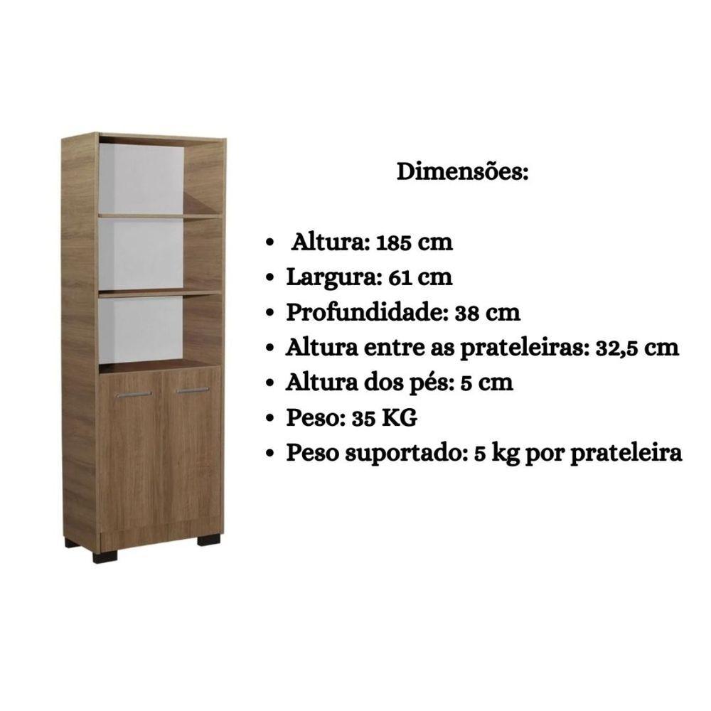 Estante Para Livros Multiuso Onix Mel 4 Prateleira Com Porta Quem é um verdadeiro apaixonado pelos livros sabe o quanto eles são valiosos e merecem um espaço especial, não é? E, para isso, nada melhor do que contar com a Estante Livreiro Organizador Onix. Um móvel multifuncional, ele pode ser utilizado em diferentes cômodos na sala, na recepção, no escritório, home office, na cozinha, na dispensa ou no quarto. O móvel possui o tamanho ideal para você dispor os seus itens e até harmonizá-los com objetos decorativos. Legal né? Compre já a Estante com prateleiras e ouse na sua utilização deixando seu ambiente ainda mais lindo! Garanta já a sua! Dimensões: Altura: 185 cm Largura: 61 cm Profundidade: 38 cmAltura entre as prateleiras: 32,5 cm Altura dos pés: 5 cm Peso: 35 KG Peso suportado: 5 kg por prateleira Especificações do Produto: Estrutura: MDP madeirado FF 15mm de alta resistência Puxador e Pés: PVC Acabamento: FoscoQuantidade de prateleiras: 4 Quantidade de portas: 2 Dobradiças: Métalicas Sistema de montagem: Minifix/Cavilhas/Pregos/Parafusos Manual de montagem: Sim Montagem: Recomendamos que seja feita por um profissional Garantia: 3 meses contra defeito de fabricação Instruções de Limpeza: Utilizar um pano limpo levemente úmido e detergente neutro Você irá receber: 01 volume Observações Relevantes: - Produto para uso residencial em ambiente interno, não devendo ficar exposto diretamente ao sol, calor e umidades excessivas; - Pode haver alguma diferença de tonalidade entre a imagem e o produto real, por conta do tratamento de imagens e a calibração de cores do seu monitor; - As imagens são meramente ilustrativas, não acompanham objetos de decoração e eletros; - Confira as dimensões do produto no momento da compra e certifique-se de que passará normalmente por escadas, elevadores, portas e corredores;