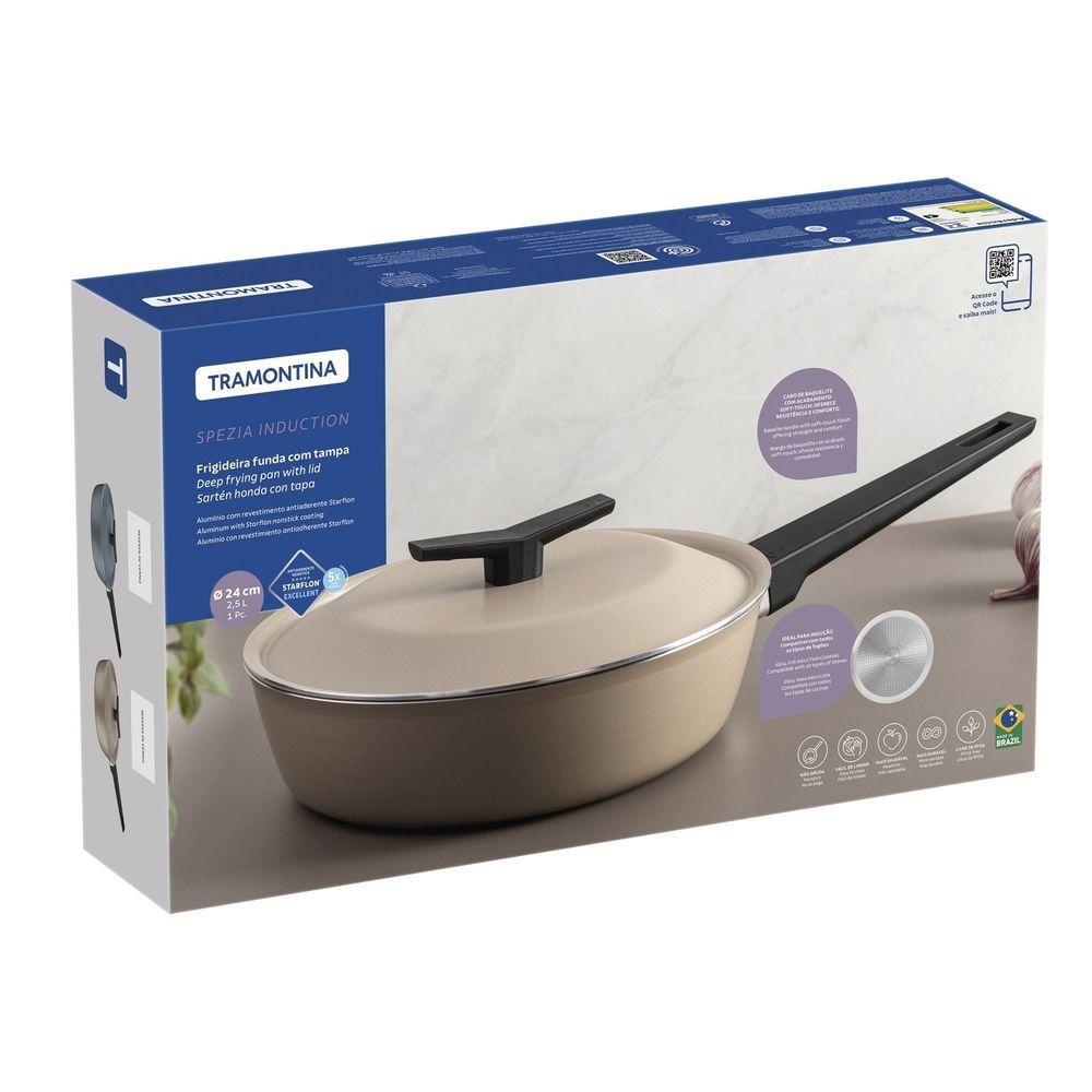 Frigideira Funda Tramontina Spezia Induction Antiaderente Starflon Excellent Azul Tampa 24 Cm TramontinaFrigideira Funda Tramontina Spezia Induction Antiaderente Starflon Excellent Azul Tampa 24 cm Tramontina -Frigideira Funda Tramontina Spezia Induction Antiaderente Starflon Excellent Azul Tampa 24 cmTorne seus pratos ainda mais saborosos com a frigideira funda Tramontina Spezia Induction em alumínio com revestimento interno e externo em antiaderente Starflon Excellent azul com tampa 24 centímetros e 2,5 litros de capacidade. Feita em alumínio com espessura de 3 milímetros, garante aquecimento rápido e uniforme, enquanto o revestimento antiaderente Starflon Excelente impede que os alimentos grudem, facilitando a limpeza. Acompanha tampa de alumínio, proporcionando segurança e leveza. Compatível com fogões a gás, elétrico, vitrocerâmico e indução.Corpo de alumínio com espessura de 3 mm que proporciona cozimento rápido e uniforme.Revestimento interno e externo de antiaderente Starflon Excellent carbono que não gruda, é fácil de limpar, mais durável e não é prejudicial à saúde, pois é livre de PFOA.Cabo de baquelite com acabamento soft-touch: oferecem resistência e conforto.Tampa de alumínio: fácil limpeza e leveza no manuseio. Pegador de nylon.Para maior durabilidade não utilize em máquinas de lavar.Fundo de indução: mais segurança e rapidez no cozimento!Contato indutivo 15,0 centímetros.Pode ser utilizada nos fogões: gás, elétrico, vitrocerâmico - resistência elétrica e indução.Cuidados com o produto A capacidade volumétrica máxima para cozimento é de 3/4 da capacidade total da peça.Posicione o cabo do utensílio voltado ao centro do fogão.Em fogões com grade, centralize a peça sobre a chama ou fonte de calor e alinhe o cabo com a grade.Utensílios quentes devem estar fora do alcance das crianças.Antes do primeiro uso, lave com esponja macia, sabão neutro ou detergente líquido.Depois de secar, unte a área interna com óleo ou gordura e leve ao fogo por um ou dois minutos. Deixe esfriar e lave novamente.Seu utensílio Starflon está pronto para uso com ou sem gordura, sempre em fogo baixo ou médio (nunca superior a 260 ºC).Em fogões de indução, usar somente em potência baixa ou média e evitar a movimentação da peça para prevenir riscos na superfície do fogão.Ao manusear seu utensílio aquecido, cuide para não arranhar/riscar o revestimento externo.Evite manchas, não deixando escorrer gordura e alimentos na área externa da peça.Caso esta situação ocorra, é recomendado realizar a limpeza imediata do local com um pano umedecido em água.Para mexer os alimentos use somente utensílios de silicone, nylon ou madeira.Com o uso, a alça, o cabo e o pegador podem afrouxar devido à dilatação normal dos materiais. Reaperte apenas o suficiente, sem forçar.Limpeza: Evite a imersão do utensílio quente em água fria.Nunca utilize produtos abrasivos na lavagem.Se deixar queimar alimentos, umedeça a área e reserve até que possa remover os resíduos grudados com esponja e sabão.Para maior durabilidade não utilize em máquinas de lavar.Para descarte do produto e embalagem siga as orientações de reciclagem vigentes.Garantia90 dias para vícios ou defeitos de fabricação. - Produto com certificação compulsória certificada pelo OCP 0070 - SENAI, registro 009648/2019, modelo frigideria funda e classificação de antiaderência A (ótima), conforme portaria INMETRO 499/2021. -Características Gerais do Produto:Garantia: - 3 Meses