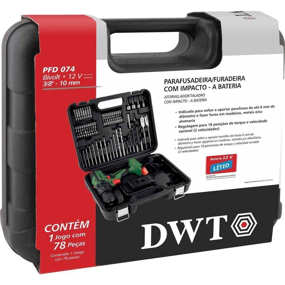 Parafusadeira/furadeira Impacto A Bateria 12v Fonte Bivolt Automática Jogo 74 Acessórios Pfd 074 Dwt Ostenvonder
