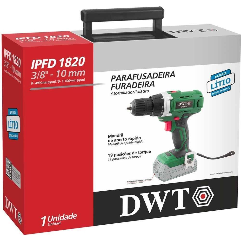 Parafusadeira/furadeira A Bateria, 18 V, Sem Bateria E Sem Carregador, Ipfd 1820, Dwt OstenvonderParafusadeira/furadeira a Bateria, 18 V, sem Bateria e sem Carregador, Ipfd 1820, DWT OstenVonder -Conteúdo da embalagem: 1 Parafusadeira/furadeira.Aplicação: Indicada para soltar e apertar parafusos e para fazer furos em madeiras ou metais. Não indicada para uso em concreto.BATERIAS INDICADAS:(2 Ah) IBD 1802 - 60.14.180.200(4 Ah) IBD 1804 - 60.14.180.400CARREGADORES INDICADOS:Carregamento rápido ICBD 1806 - 60.14.180.600Carregamento convencional ICBD 1805 - 60.14.180.500.Destaques: Este equipamento utiliza um modelo de bateria que pode ser intercambiável (não acompanha), ou seja, uma bateria que é compatível com outros modelos de ferramentas a bateria DWT. Por isso, em sua próxima compra de ferramenta a bateria DWT, procure um modelo que comece com a referência I, ou que esteja identificado com o selo Bateria Intercambiável DWT. Desta forma, você garante modelos mais econômicos, sem a necessidade de aquisição de novas baterias e carregadores para uso em seu equipamento. Compacta e prática de usar. Possui regulagem de torque em 19 posições, adequando-se à necessidade de aperto de acordo com a dureza do material e 1 posição para perfuração, LED para melhor visibilidade do local de trabalho, cabo com revestimento emborrachado, proporcionando maior conforto ao operador. Conta também com mandril de aperto rápido, que facilita a troca rápida do acessório.Garantia - E (CDC): Garantia legal: 90 dias + Garantia contratual: 9 meses (Para locadoras, garantia única e exclusiva de 90 dias)Referência: 6014182000Modelo: IPFD 1820Bateria: Não acompanhaCapacidade do mandril: 3/8 - 10 mmTipo de mandril: Aperto rápidoTipo de velocidade: Variável (2 velocidades)Sistema de reversão: SimRotação da furadeira/parafusadeira: 0 - 400/min / 0 - 1.100/minTorque máximo/força de aperto: 24,0 N.m (2,4 kgf.m)Capacidade máxima de perfuração em aço: 10 mmCapacidade máxima de perfuração em madeira: 13 mmTensão de entrada: Não acompanhaFrequência: 50 Hz / 60 HzAceleração transmitida nas mãos - braços do operador - ah: 3,86 m/s²Incerteza da aceleração transmitida nas mãos - braços do operador - k: 1,5 m/s²Massa aproximada (peso): 2.19 kgSegue norma: ABNT NBR IEC 60745-1, ABNT NBR IEC 60745-2-1 e ABNT NBR IEC 60745-2-2Destaques Comercial: Equipamento compatível com bateria intercambiável DWT, com regulagem de torque, LED, cabo emborrachado e mandril de aperto rápido, garantindo praticidade e conforto ao uso.Aplicação Comercial: Indicada para apertar e soltar parafusos e furar madeira ou metal. Compatível com baterias IBD 1802, IBD 1804 e carregadores ICBD 1805 e ICBD 1806.Características Gerais do Produto:Garantia: - 3 Meses
