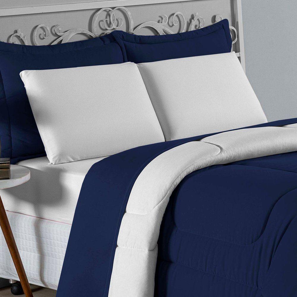 Kit Edredom Dupla Face + Jogo De Lençol Casal Nobre 6 Peças Malha 100% Algodão - Azul-marinho / BrancoTransforme seu quarto em um ambiente de descanso luxuoso com o Kit Cama Completa Casal Nobre 6 Peças. A união perfeita entre a praticidade do dia a dia e o conforto superior da malha 100% algodão fio penteado.Por que este Kit é uma ótima escolha?- Toque Extremamente Macio: A confecção em Malha 100% Algodão Fio 30/1 Penteado proporciona uma sensação suave e natural, ideal para quem valoriza o conforto da pele.- Visual Sofisticado: O edredom dupla face e os dois porta travesseiros matelados conferem volume e elegância à cama, dispensando composições difíceis.- Durabilidade Superior: O fio penteado garante um tecido resistente, que mantém a aparência de novo e não forma bolinhas (anti-pilling).- Ajuste Perfeito: O lençol de baixo com elástico abraça colchões de até 30cm de altura, mantendo a cama sempre organizada.Produto composto por (Total 06 Peças):Do Kit Edredom (03 Peças):01 Edredom Casal Dupla Face: 2,00m x 2,20m02 Porta Travesseiros Matelados: 50cm x 70cmDo Jogo de Lençol (03 Peças):01 Lençol de Baixo com Elástico: 1,38m x 1,98m x 30cm02 Fronhas: 70cm x 50cmAtenção: Este kit é composto pelo jogo de cama essencial (lençol com elástico e fronhas) e não inclui o lençol de cima (sobre lençol).Composição:Tecido (Todas as peças): Malha 100% Algodão - Fio 30/1 PenteadoEnchimento (Edredom e Porta Travesseiros): 100% Poliéster (Edredom com fibra siliconada)Forro (Apenas Porta Travesseiros): 100% Polipropileno
