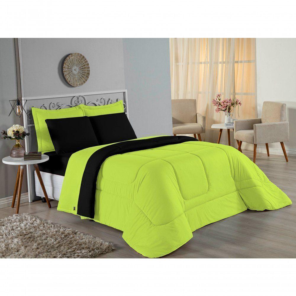 Kit Edredom Dupla Face + Jogo De Lençol Casal Nobre 6 Peças Malha 100% Algodão - Pistache / PretoTransforme seu quarto em um ambiente de descanso luxuoso com o Kit Cama Completa Casal Nobre 6 Peças. A união perfeita entre a praticidade do dia a dia e o conforto superior da malha 100% algodão fio penteado.Por que este Kit é uma ótima escolha?- Toque Extremamente Macio: A confecção em Malha 100% Algodão Fio 30/1 Penteado proporciona uma sensação suave e natural, ideal para quem valoriza o conforto da pele.- Visual Sofisticado: O edredom dupla face e os dois porta travesseiros matelados conferem volume e elegância à cama, dispensando composições difíceis.- Durabilidade Superior: O fio penteado garante um tecido resistente, que mantém a aparência de novo e não forma bolinhas (anti-pilling).- Ajuste Perfeito: O lençol de baixo com elástico abraça colchões de até 30cm de altura, mantendo a cama sempre organizada.Produto composto por (Total 06 Peças):Do Kit Edredom (03 Peças):01 Edredom Casal Dupla Face: 2,00m x 2,20m02 Porta Travesseiros Matelados: 50cm x 70cmDo Jogo de Lençol (03 Peças):01 Lençol de Baixo com Elástico: 1,38m x 1,98m x 30cm02 Fronhas: 70cm x 50cmAtenção: Este kit é composto pelo jogo de cama essencial (lençol com elástico e fronhas) e não inclui o lençol de cima (sobre lençol).Composição:Tecido (Todas as peças): Malha 100% Algodão - Fio 30/1 PenteadoEnchimento (Edredom e Porta Travesseiros): 100% Poliéster (Edredom com fibra siliconada)Forro (Apenas Porta Travesseiros): 100% Polipropileno
