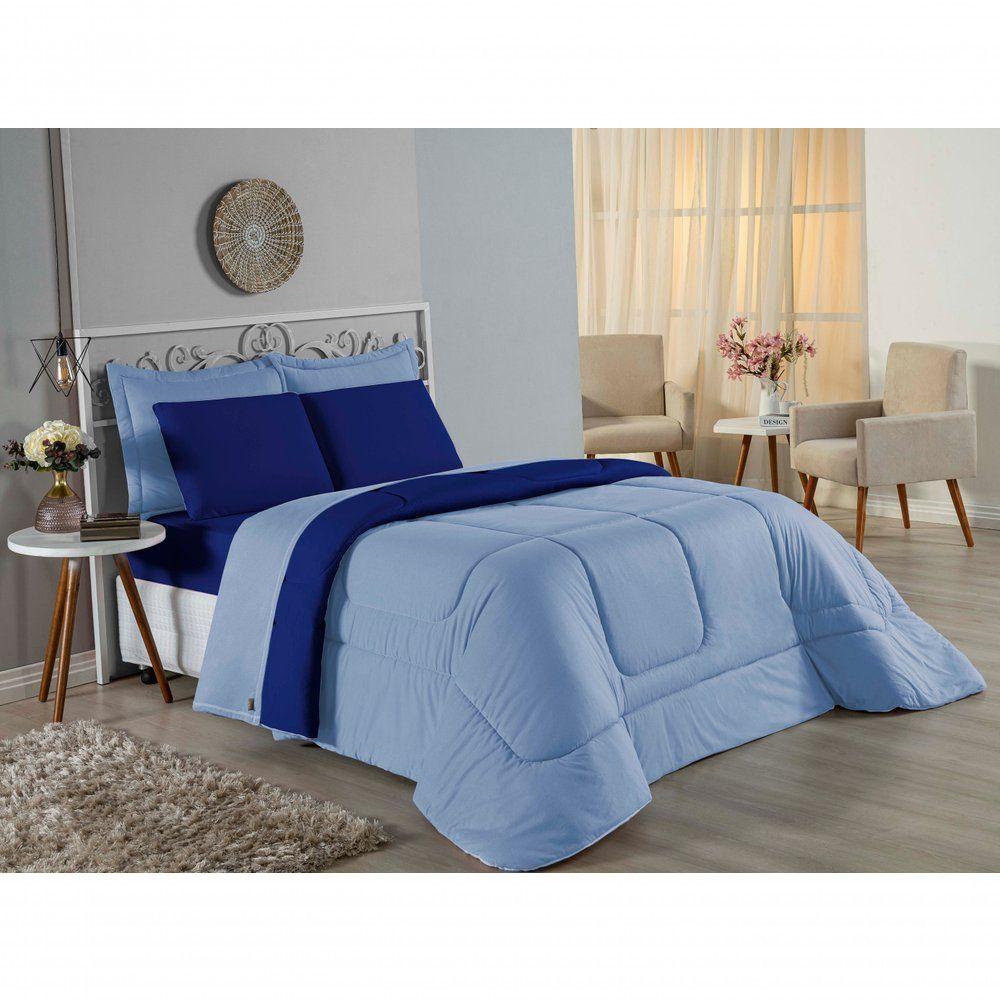 Kit Edredom Dupla Face + Jogo De Lençol Casal Nobre 7 Peças Malha 100% Algodão - Azul-bebê / RoyalVista sua cama com elegância total e conforto absoluto com o Kit Cama Completa Casal Nobre 7 Peças. A solução definitiva para quem busca um enxoval completo, coordenado e com a maciez irresistível da malha de algodão.Por que este Kit é uma ótima escolha?- Jogo Completo 7 Peças: Inclui edredom, porta travesseiros decorativos e o jogo de cama completo (com lençol de cima e de baixo), oferecendo a experiência completa de conforto.- Malha Premium: Confeccionado em 100% Algodão Fio 30/1 Penteado, garantindo um toque suave, natural e livre de bolinhas.- Versatilidade na Decoração: O edredom dupla face permite variar o visual, enquanto o lençol de cima com vira adiciona charme à cama posta.- Aconchego e Praticidade: Une o aquecimento do edredom à facilidade do lençol com elástico, perfeito para o dia a dia.Produto composto por (Total 07 Peças):Do Kit Edredom (03 Peças):01 Edredom Casal Dupla Face: 2,00m x 2,20m02 Porta Travesseiros Matelados: 50cm x 70cmDo Jogo de Lençol (04 Peças):01 Lençol de Cima (Virol): 2,40m x 2,20m01 Lençol de Baixo com Elástico: 1,38m x 1,98m x 30cm02 Fronhas: 70cm x 50cmComposição:Tecido (Todas as peças): Malha 100% Algodão - Fio 30/1 PenteadoEnchimento (Edredom e Porta Travesseiros): 100% Poliéster (Edredom com fibra siliconada)Forro (Apenas Porta Travesseiros): 100% Polipropileno