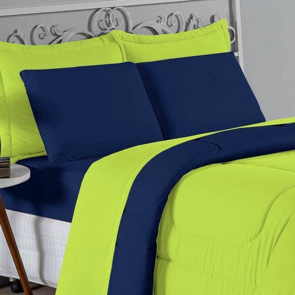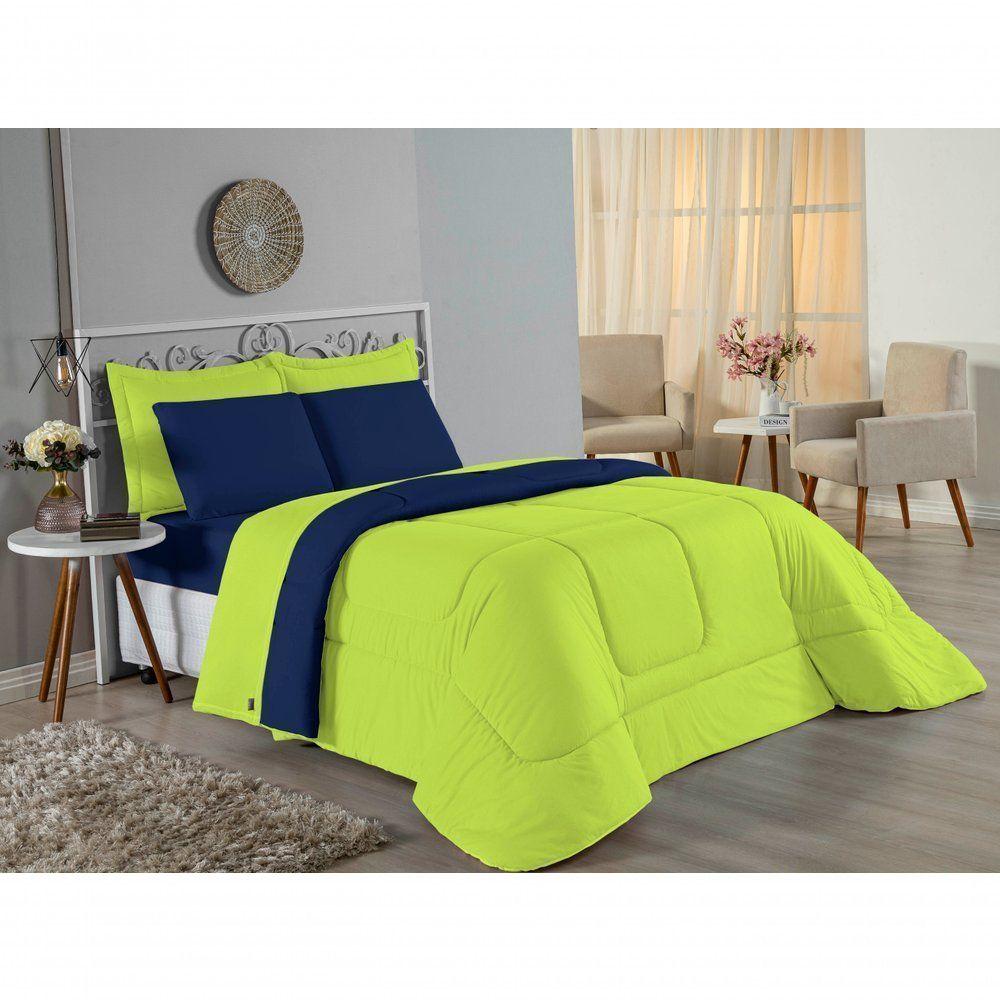 Kit Edredom Dupla Face + Jogo De Lençol Casal Viúva Nobre 6 Peças Malha 100% Algodão - Pistache / Azul-marinho