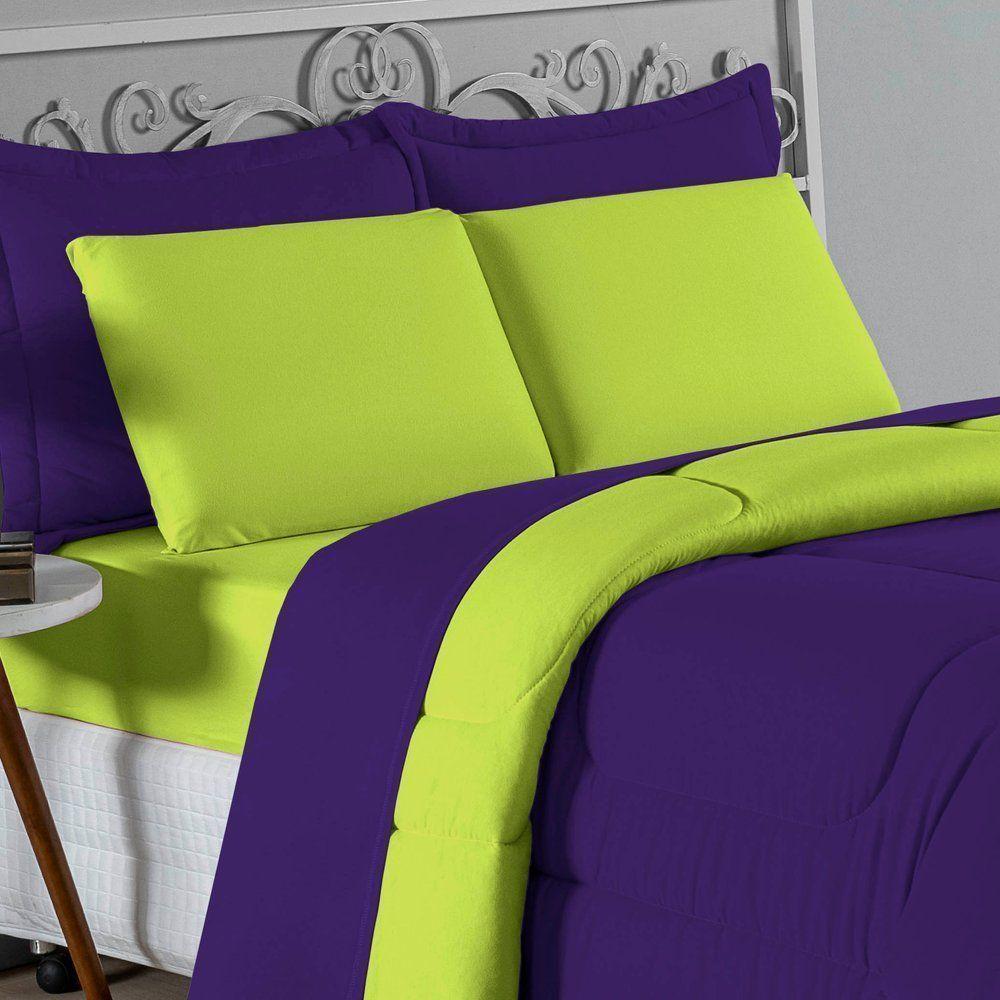 Kit Edredom Dupla Face + Jogo De Lençol Casal Nobre 7 Peças Malha 100% Algodão - Roxo / Pistache