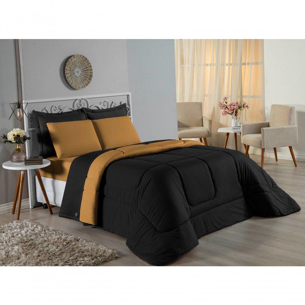Kit Edredom Dupla Face + Jogo De Lençol Casal Nobre 7 Peças Malha 100% Algodão - Preto / Cobre