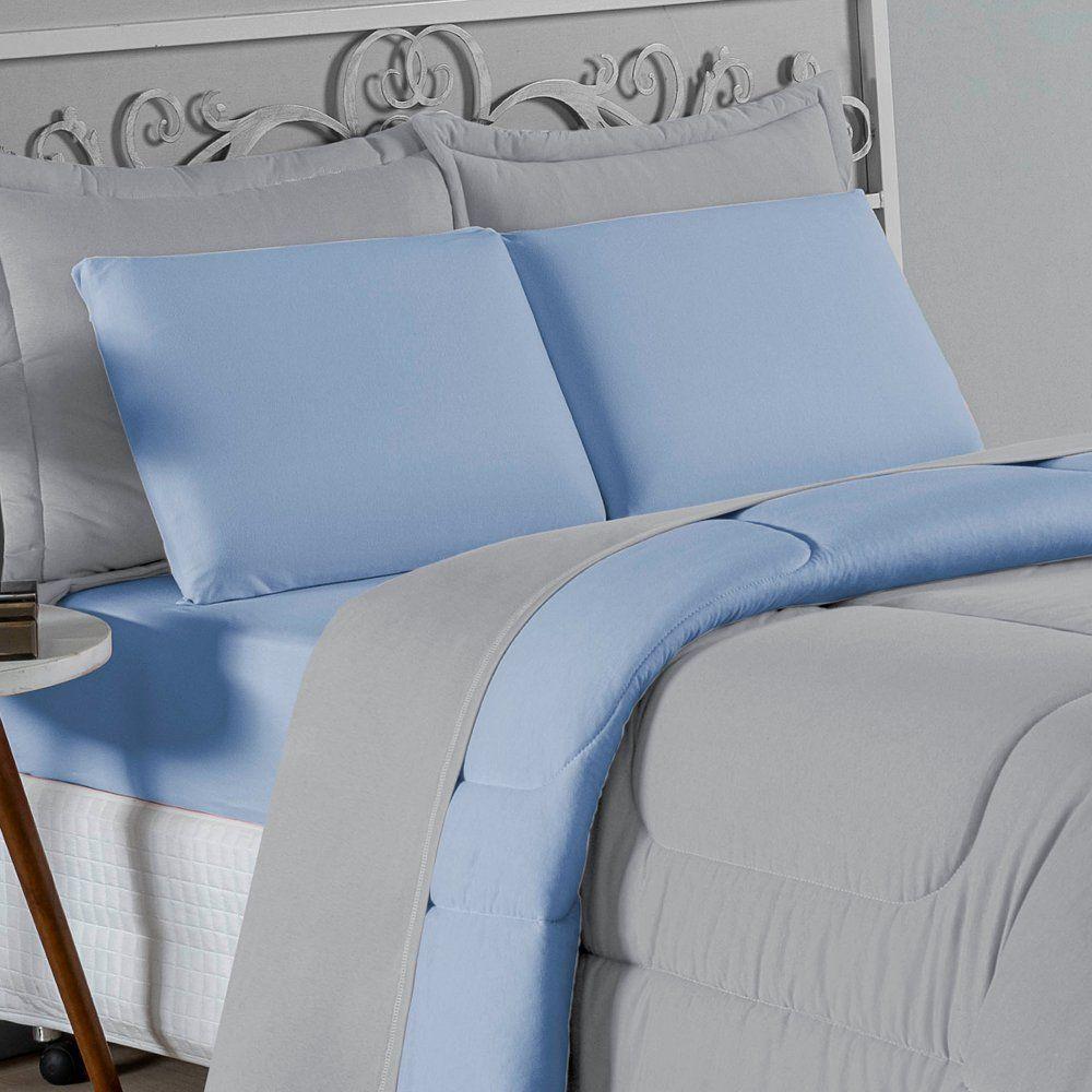Kit Edredom Dupla Face + Jogo De Lençol Casal Viúva Nobre 7 Peças Malha 100% Algodão - Cinza / Azul-bebê