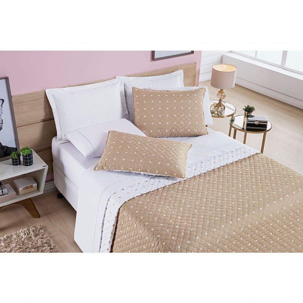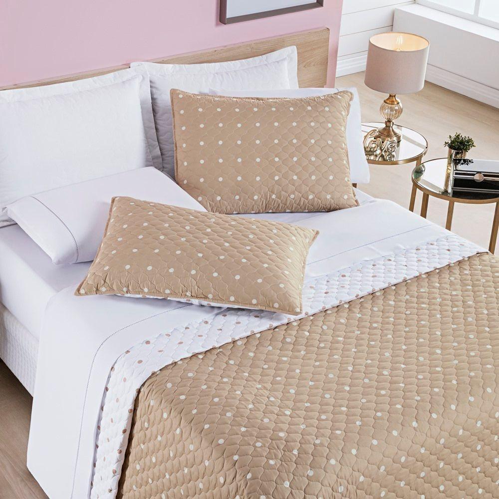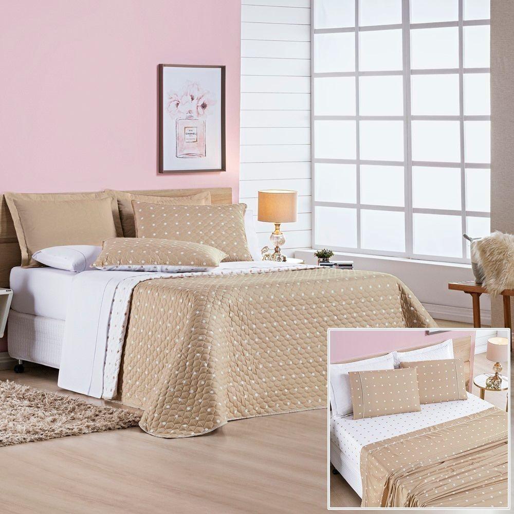 Cobre Leito + Jogo De Cama Solteiro + Jogo De Banho Petit Poá 10 Peças 100% Poliéster - CaquiTraga um charme clássico e atemporal para a suíte completa com o Kit Coordenado Petit Poá Solteiro 10 Peças. Este conjunto exclusivo estende a adorável estampa de bolinhas (petit poá) do quarto para o banheiro, criando um ambiente perfeitamente harmonioso.O kit une o conforto prático do Kit Cama 05 Peças em Micro Percal Poliéster com a maciez superior do Jogo de Banho 05 Peças em 100% Algodão 450g/m².Por que este Kit Coordenado é uma ótima escolha?Coordenação Completa (Quarto e Banho): Crie um visual de suíte decorada, onde o charme clássico do Petit Poá flui do cobre leito para as toalhas.Conforto no Quarto: O kit cama é feito em Micro Percal 200 Fios (100% Poliéster), com toque macio e secagem rápida. O cobre leito é dupla face e matelassado, e o kit inclui 2 peças para travesseiro (1 porta travesseiro + 1 fronha).Qualidade no Banho: O jogo de banho é confeccionado em 100% Algodão com alta gramatura (450g/m²), garantindo excelente absorção e um toque macio. As toalhas possuem lindos padrões em jacquard.Kit Completo 10 Peças: Uma solução única para vestir sua cama e seu banheiro com o mesmo tema, incluindo lençol de cima, cobre leito e um jogo de banho completo com piso.Produto composto por (Total 10 Peças):Do Kit Cama (05 Peças):01 Cobre leito Solteiro Dupla Face 2,40m x 1,80m01 Porta travesseiro matelassado 70cm x 50cm01 Lençol de cima 2,40m x 1,50m01 Lençol de baixo c/ elástico (para colchão de 1,88m x 88cm x 30cm alt.)01 Fronha estampada 70cm x 50cmDo Jogo de Banho (05 Peças):02 Toalhas de Banho 1,50m x 75cm02 Toalhas de Rosto 80cm x 50cm01 Piso 75cm x 50cmComposição:Kit Cama (05 Peças):Tecido (Todas as 5 peças): Micro Percal 200 Fios 100% PoliésterEnchimento (Cobre Leito e Porta Travesseiro): 100% PoliésterJogo de Banho (05 Peças):Tecido: 100% Algodão – Gramatura 450g/m²