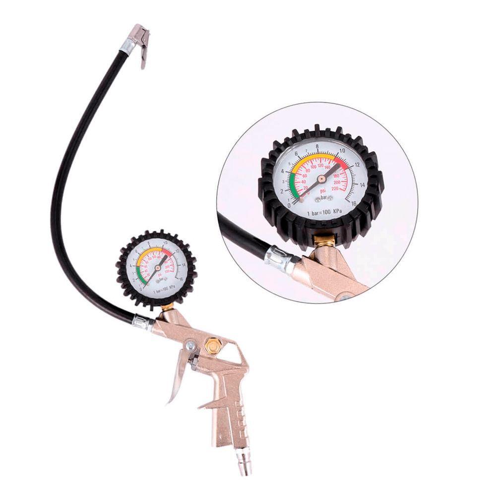 Calibrador Manual Pneus Pratico Manômetro 220psiCalibrador Manual é indicado para inflar, esvaziar e medir a pressão dos pneus, pode ser em automóveis leves, motos, bicicletas e até mesmo em pneus menores como carrinho de mão que possuam câmara de ar, conta com manômetro e encaixe de rosca de 1 / 4 NPT, possui estrutura em alumínio que proporciona uma maior resistência à oxidação e corrosão, seu bico é ível e oferece mais praticidade na aplicação.Informações Técnicas:Calibrador e Inflador com Manômetro Mangueira ível Bico com Presilha Fácil Operação Fabricado em Liga de Alta Qualidade Produz Agilidade na Hora do Trabalho Encaixe de Rosca de 1 / 4 NPT Manômetro Para Monitoramento de Pressão Pressão de Trabalho 220 PSI/16BARItens Inclusos:1x Calibrador Manual de Pneus