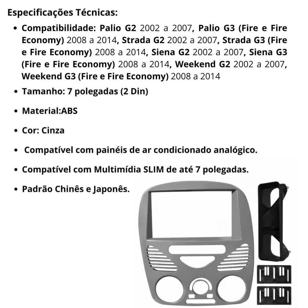 Central Multimídia 2 Din Mp5 Fiat Weekend G2 Câmera Moldura CinzaPRUDEN AUTO PARTS:Somos a PRUDEN AUTO PARTS, uma empresa especializada em vendas online. Temos como compromisso a satisfação de nossos clientes, na busca por melhores preços, produtos de qualidade e transparência em serviços. Comprando conosco você terá a garantia que receberá seu produto nas seguintes condições:Ficou alguma dúvida? estamos à disposição pelo campo de mensagens!SOBRE O PRODUTO:Veículos Compatíveis:- Palio G2 2002 a 2007- Palio G3 (Fire e Fire Economy) 2008 a 2014- Strada G2 2002 a 2007- Strada G3 (Fire e Fire Economy) 2008 a 2014- Siena G2 2002 a 2007- Siena G3 (Fire e Fire Economy) 2008 a 2014- Weekend G2 2002 a 2007- Weekend G3 (Fire e Fire Economy) 2008 a 2014>>> Sobre o Produto:Seu carro precisa de uma CENTRAL MULTIMÍDIA MP5 PLAYER para deixar seus momentos no trânsito menos estressantes e mais divertidos, por isso, aposte nesta belíssima CENTRAL MULTIMÍDIA com tela de 7 polegadas TOUCH SCREEN para você ver seus vídeos, clipes e muito mais!>>> Especificação Técnicas:- Tela Full Touch Screen 7 Polegadas Capacitiva;- Resolução da Tela: 800x 480 Pixels;- Botões com Iluminação em LED RGB;- Controle de Luminosidade da Tela;- Entradas Frontais USB e Micro SD;- Entrada Auxiliar P2;- Reproduz Vários Formatos de Áudio;- Reproduz Vídeos em até 1080p;- Função Bluetooth para Músicas, Chamadas e Contatos;- Possui Microfone Integrado;- Espelhamento de Tela Através de USB;- Possui Busca por Pasta;- Acompanha Câmera de Ré ;- Sintonização de Rádio FM;- Equalizador Pré-Definido (Jazz, Pop, Rock e Classic);- Potência de Operação: 12V;- Dimensões Aproximadas (LxAxP): 18x10,5x6,5cm;- Não Possuí Leitor de CD/DVD;- Marca: ROADSTAR; JR8; H-TECH; E-TECH; FIRST OPTION; FP; TIGER.Obs: Não possuí marca fixa, o multimídia é enviado de acordo com a disponibilidade em estoque uma das marcas acima! Sendo que todas tem as mesmas configurações e funções. Conforme imagens do anúncio apenas o DESIGN dos botões e dos controles podem variar de acordo com a disponibilidade em estoque.Este aparelho também possuí sistema configurável para utilizar os COMANDOS DE VOLANTE do seu veículo, no entanto, para configurar é necessário adquirir uma INTERFACE DE COMANDO DE VOLANTE específica que não está inclusa no kit. Solicite o link no campo de perguntas!>>> Usando Seu Via Cabo USB Você Pode Espelhar a tela e os Aplicativos! Por Exemplo: GPS ( MAP`S OU WAZE); YOUTUBE; DISNEY PLUS; NETFLIX; ; SPOTIFY entre outros!- COMO FAZER O ESPELHAMENTO EM CELULARES ? ()Em celulares é necessário ativar a DEPURAÇÃO USB, consulte na internet como fazer esse processo! É simples, mas cada modelo de tem seu proprio método de ativar esta função. Logo após, conecte o cabo USB do em ambos os aparelhos e autorize o espelhamento na tela do !Caso seu não tenha o suporte necessário para espelhar, automaticamente aparecerá na tela do um aviso para abrir um link e instalar o APP de espelhamento! Após instalado, remova o cabo USB, abra o APP de espelhamento, volte a tela inicial do deixando o APP em segundo plano e coloque novamente o cabo USB e pronto! Você já verá a tela do seu no multimídia!Lembre-se que para a imagem funcionar em tela cheia ela também deve estar em tela cheia no ! Como quando viramos o de lado e a imagem toma conta de toda a tela ao assistir videos, utilizar GPS e etc.- COMO FAZER O ESPELHAMENTO EM CELULARES IOS? ()Em celulares com sistema IOS não é necessário instalar nenhum APP ou fazer configurações, apenas conectar o cabo USB do em ambos aparelhos e autorizar na tela do .Lembre-se que para a imagem funcionar em tela cheia ela também deve estar em tela cheia no ! Como quando viramos o de lado e a imagem toma conta de toda a tela ao assistir videos, utilizar GPS e etc.Obs: Se mesmo após seguir as instruções acima você não conseguir fazer o espelhamento significa que seu recebeu uma atualização de sistema, e será necessário aguardar a nova atualização da CENTRAL MULTIMÍDIA para espelhar! Você pode conferir se já está disponível para download com nossa equipe no CHAT nos detalhes de sua compra na opção ENVIAR MENSAGEM.>>> Conteúdo da Embalagem:01 UND - Central Multimídia MP5 2 Din 7 Polegadas;01 KIT - Chicotes de Alimentação;01 KIT - Câmera de Ré ();01 UND - Moldura 2 Din de Acabamento Específica ().Obs: Imagens Meramente Ilustrativas.IMPORTANTE>>> SOBRE A INSTALAÇÃO!1°- ESTE KIT NÃO ACOMPANHA CHICOTE ADAPTADOR PARA CONEXÃO PLUG AND PLAY, POIS É UM ITEM OPCIONAL DA INSTALAÇÃO, O CHICOTE DESTE APARELHO PODE SER INSTALADO FIO A FIO NO CHICOTE DO VEÍCULO. CASO QUEIRA ADQUIRIR A PARTE O CHICOTE ADAPTADOR PLUG AND PLAY SOLICITE O LINK NO CAMPO DE PERGUNTAS.2º - É OBRIGATÓRIO ATIVAR A FUNÇÃO PÓS CHAVE, OU SEJA, A CENTRAL MULTIMÍDIA IRÁ LIGAR E DESLIGAR AUTOMATICAMENTE AO GIRAR A CHAVE NA IGNIÇÃO DO VEÍCULO! ESSA FUNÇÃO PREVINE QUE A PLACA BLUETOOTH ENTRE EM PROTEÇÃO OU QUE TENHA UM CONSUMO DE BATERIA EXCESSIVO.3º - PARA QUE SEJA VÁLIDA A GARANTIA DESDE PRODUTO A INSTALAÇÃO DEVE SER FEITA POR UM CAPACITADO NA ÁREA! SEMPRE SOLICITE A DO SERVIÇO (NÃO NOS RESPONSABILIZAMOS POR VALORES GASTOS EM SERVIÇOS DE INSTALAÇÕES OU REMOÇÃO DO APARELHO).4º - NÃO NOS RESPONSABILIZAMOS POR MAL USO DO PRODUTO BEM COMO CONFIGURAÇÃO DE APARELHOS CELULARES PARA UTILIZAR A FUNÇÃO DE ESPELHAMENTO.Garantia do vendedor: 3 meses