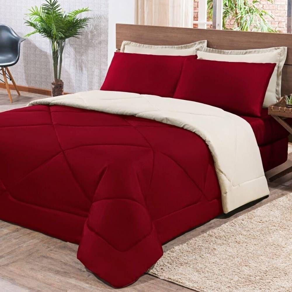 Kit Edredom + Jogo De Lençol Aconchego Look House Dupla Face Casal Queen 06 Peças - Vermelho E PalhaO Kit Look House, traz para seu ambiente um conjunto de roupas de cama com todas as peças que você precisa para deixar seu ambiente aconchegante, sem contar o conforto para as noites de sono. Produto composto por:01 Edredom 2,50m x 2,20m01 Lençol de baixo c/ elástico para colchão de 1,58m x 1,98m x 0,30cm02 Porta travesseiros 70cm x 50cm02 Fronhas de 70cm x 50cm Composição tecido: 80% Algodão / 20% Poliéster