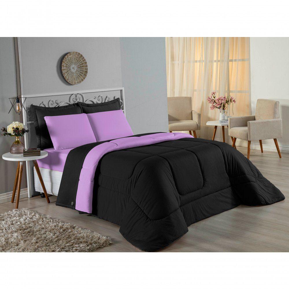 Edredom Casal Nobre 1 Peça Dupla Face 2,00m X 2,20m Malha 100% Algodão - Preto / Lilás
