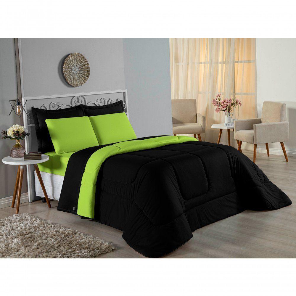 Edredom Casal Nobre 1 Peça Dupla Face 2,00m X 2,20m Malha 100% Algodão - Preto / Pistache
