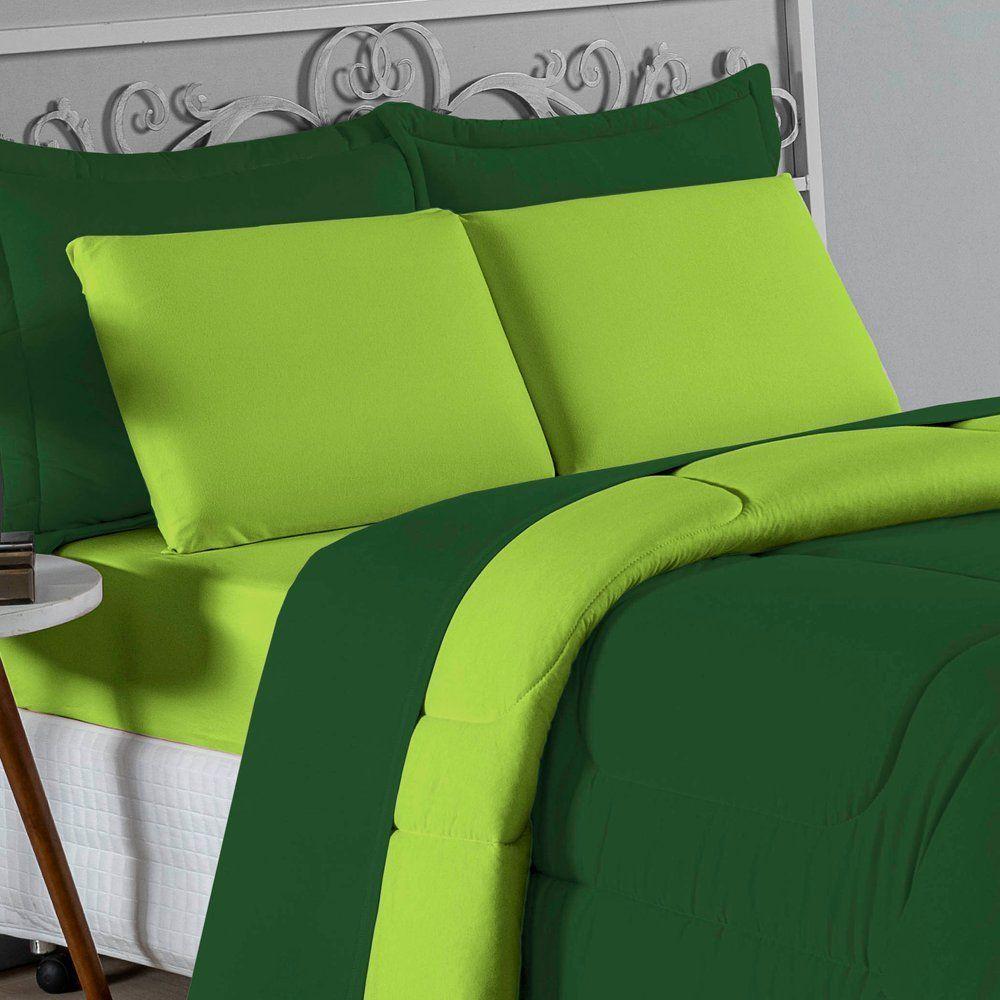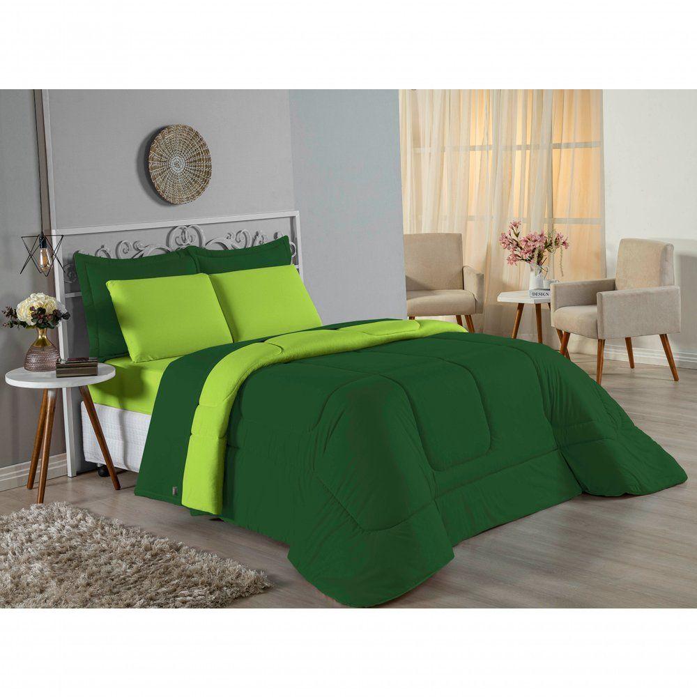 Kit Edredom Dupla Face + Jogo De Lençol Casal Nobre 7 Peças Malha 100% Algodão - Verde-bandeira / Pistache