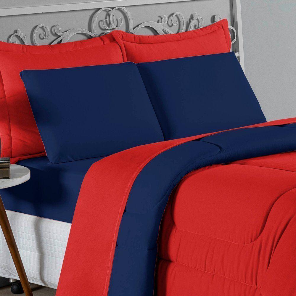 Kit Edredom Dupla Face + Jogo De Lençol Casal Nobre 7 Peças Malha 100% Algodão - Vermelho / Azul-marinhoVista sua cama com elegância total e conforto absoluto com o Kit Cama Completa Casal Nobre 7 Peças. A solução definitiva para quem busca um enxoval completo, coordenado e com a maciez irresistível da malha de algodão.Por que este Kit é uma ótima escolha?- Jogo Completo 7 Peças: Inclui edredom, porta travesseiros decorativos e o jogo de cama completo (com lençol de cima e de baixo), oferecendo a experiência completa de conforto.- Malha Premium: Confeccionado em 100% Algodão Fio 30/1 Penteado, garantindo um toque suave, natural e livre de bolinhas.- Versatilidade na Decoração: O edredom dupla face permite variar o visual, enquanto o lençol de cima com vira adiciona charme à cama posta.- Aconchego e Praticidade: Une o aquecimento do edredom à facilidade do lençol com elástico, perfeito para o dia a dia.Produto composto por (Total 07 Peças):Do Kit Edredom (03 Peças):01 Edredom Casal Dupla Face: 2,00m x 2,20m02 Porta Travesseiros Matelados: 50cm x 70cmDo Jogo de Lençol (04 Peças):01 Lençol de Cima (Virol): 2,40m x 2,20m01 Lençol de Baixo com Elástico: 1,38m x 1,98m x 30cm02 Fronhas: 70cm x 50cmComposição:Tecido (Todas as peças): Malha 100% Algodão - Fio 30/1 PenteadoEnchimento (Edredom e Porta Travesseiros): 100% Poliéster (Edredom com fibra siliconada)Forro (Apenas Porta Travesseiros): 100% Polipropileno
