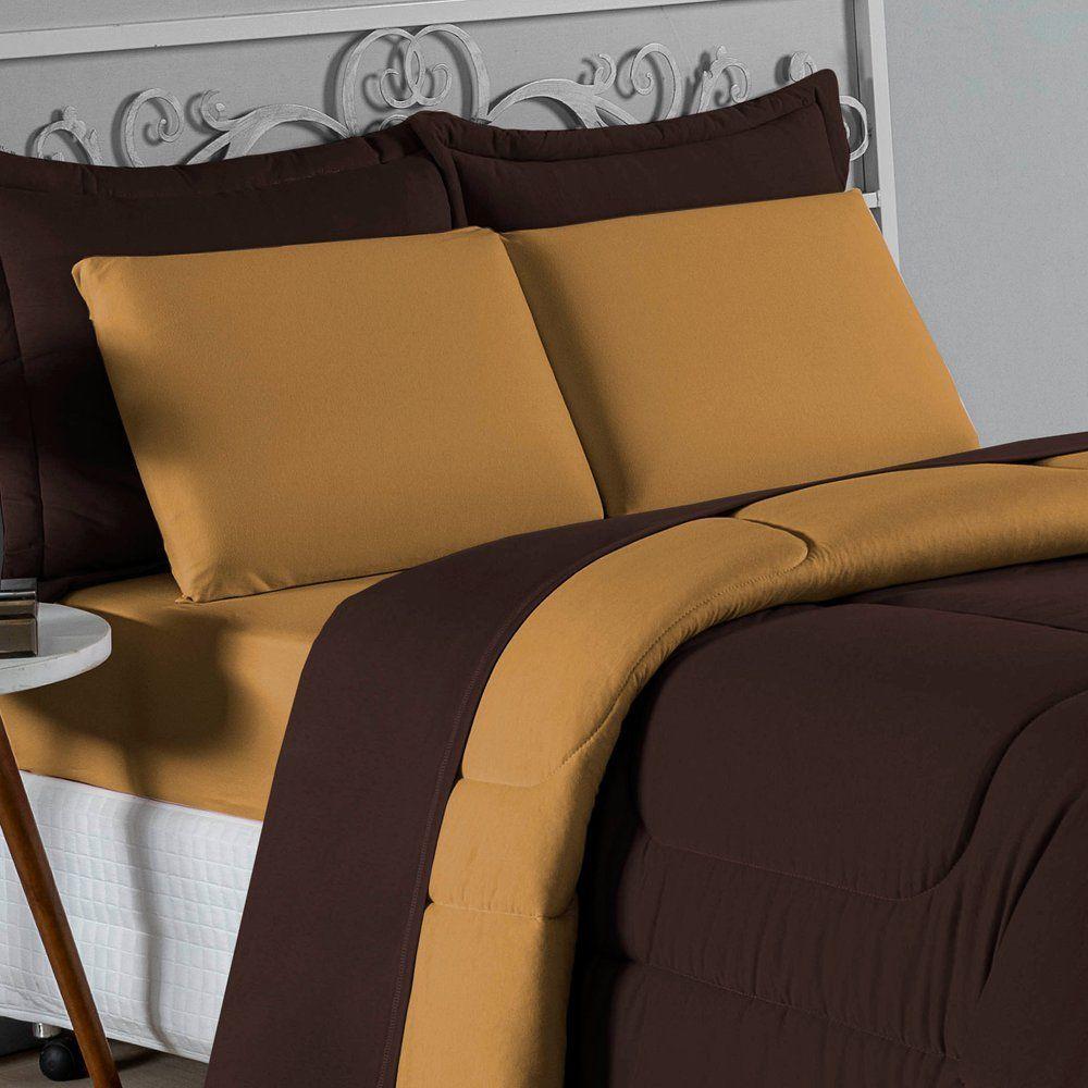 Kit Edredom Dupla Face + Jogo De Lençol Casal Nobre 7 Peças Malha 100% Algodão - Marrom / Cobre
