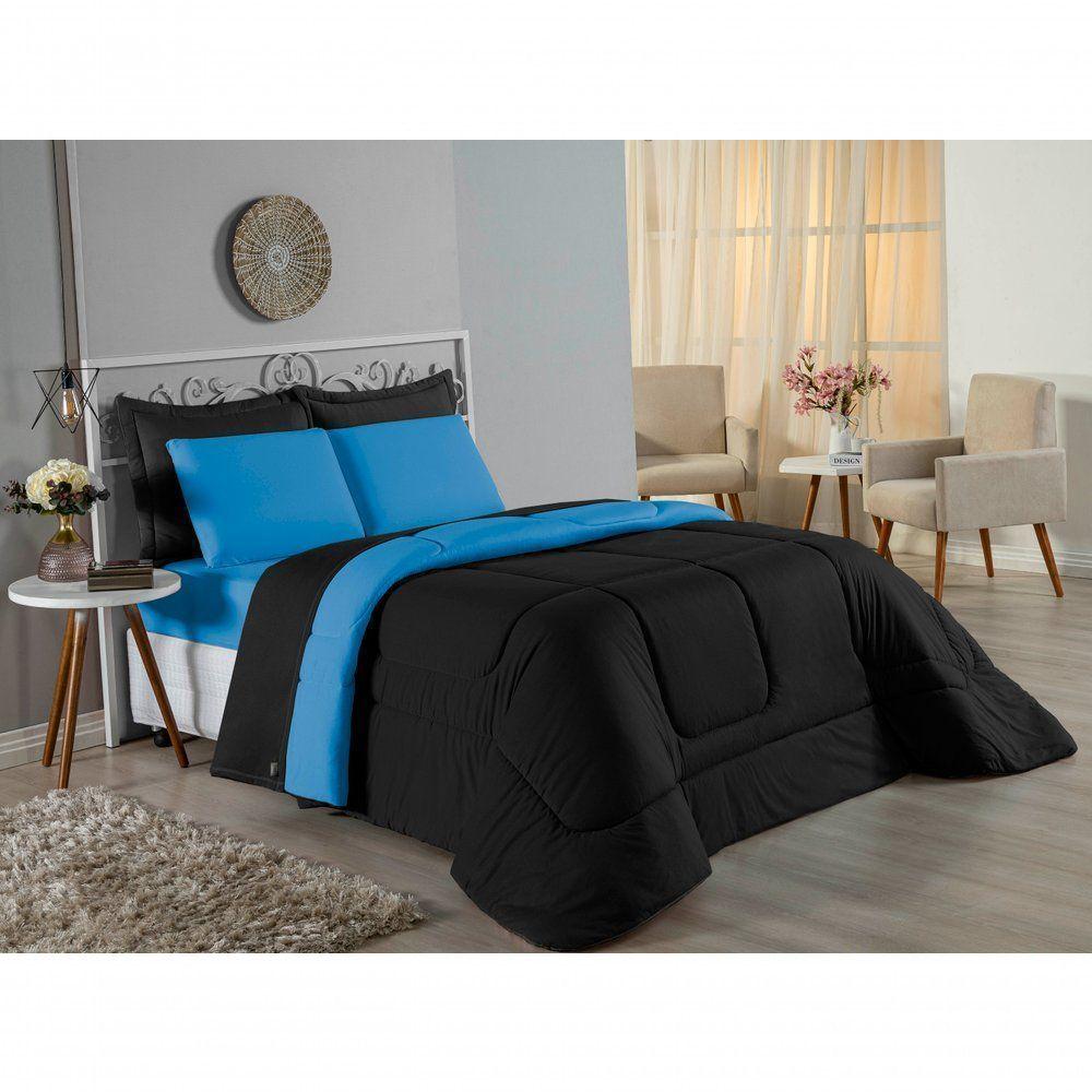 Kit Edredom Dupla Face + Jogo De Lençol Casal Nobre 7 Peças Malha 100% Algodão - Preto / Turquesa
