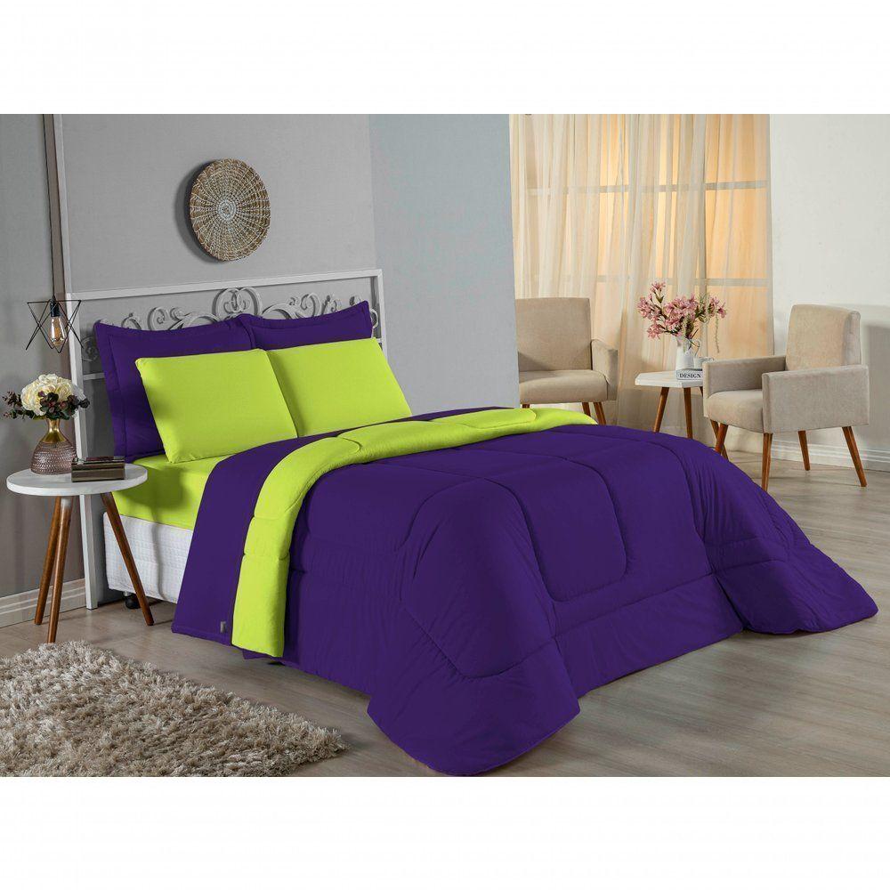 Kit Edredom Dupla Face + Jogo De Lençol Casal Nobre 7 Peças Malha 100% Algodão - Roxo / Pistache