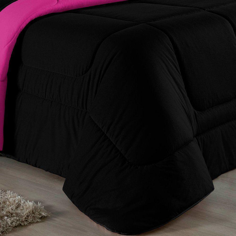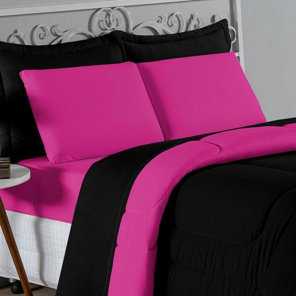 Kit Edredom Dupla Face + Jogo De Lençol Casal Nobre 7 Peças Malha 100% Algodão - Preto / Pink