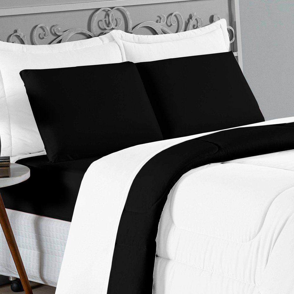 Kit Edredom Dupla Face + Jogo De Lençol Casal Viúva Nobre 6 Peças Malha 100% Algodão - Branco / Preto