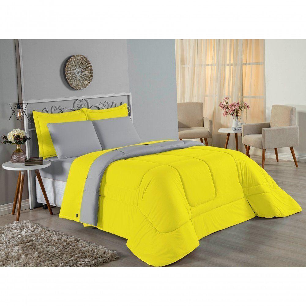 Kit Edredom Dupla Face + Jogo De Lençol Casal Viúva Nobre 7 Peças Malha 100% Algodão - Amarelo / Cinza