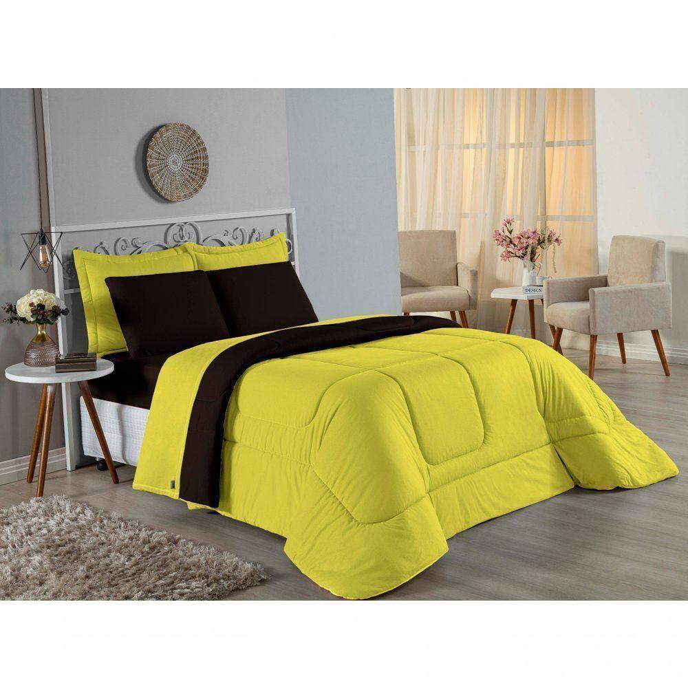 Kit Edredom Dupla Face + Jogo De Lençol Casal Viúva Nobre 7 Peças Malha 100% Algodão - Amarelo / Preto