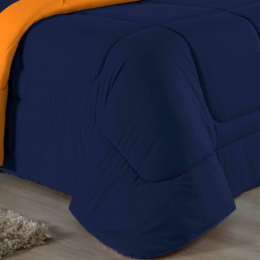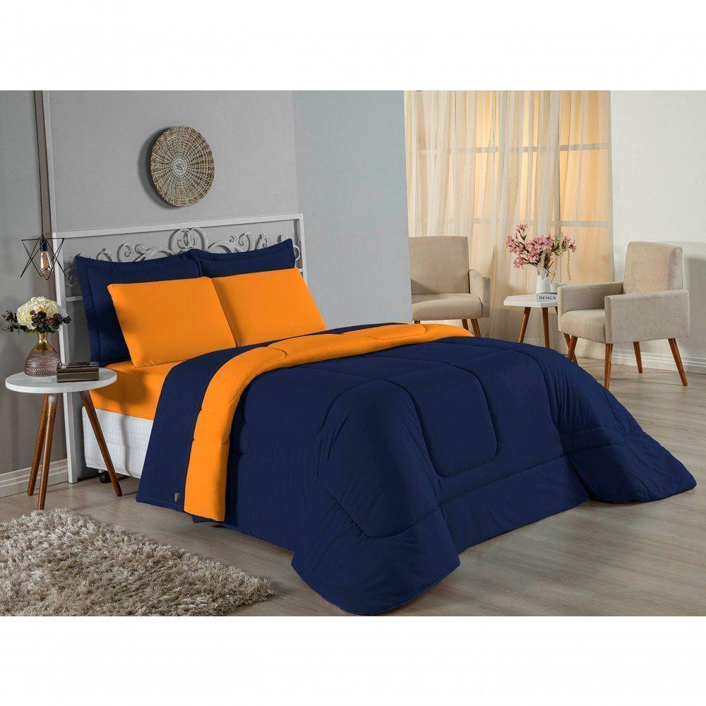 Kit Edredom Dupla Face + Jogo De Lençol Casal Viúva Nobre 7 Peças Malha 100% Algodão - Azul-marinho / Laranja