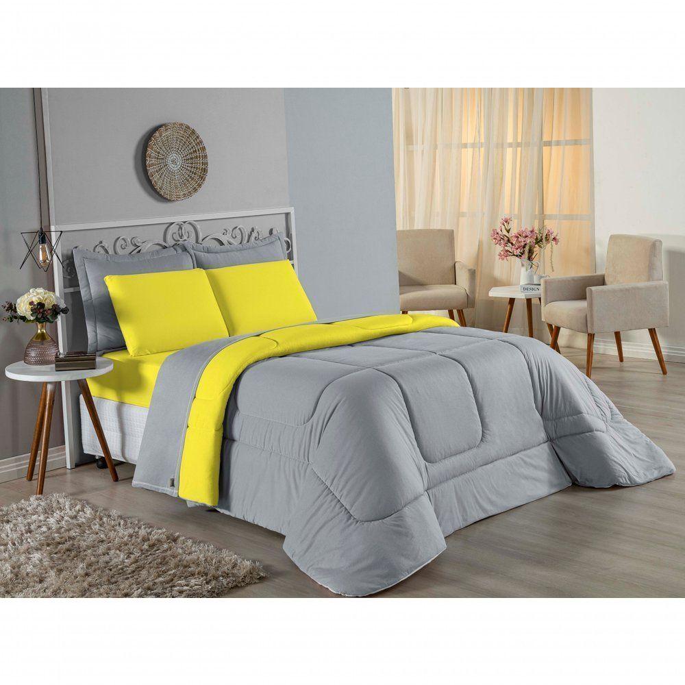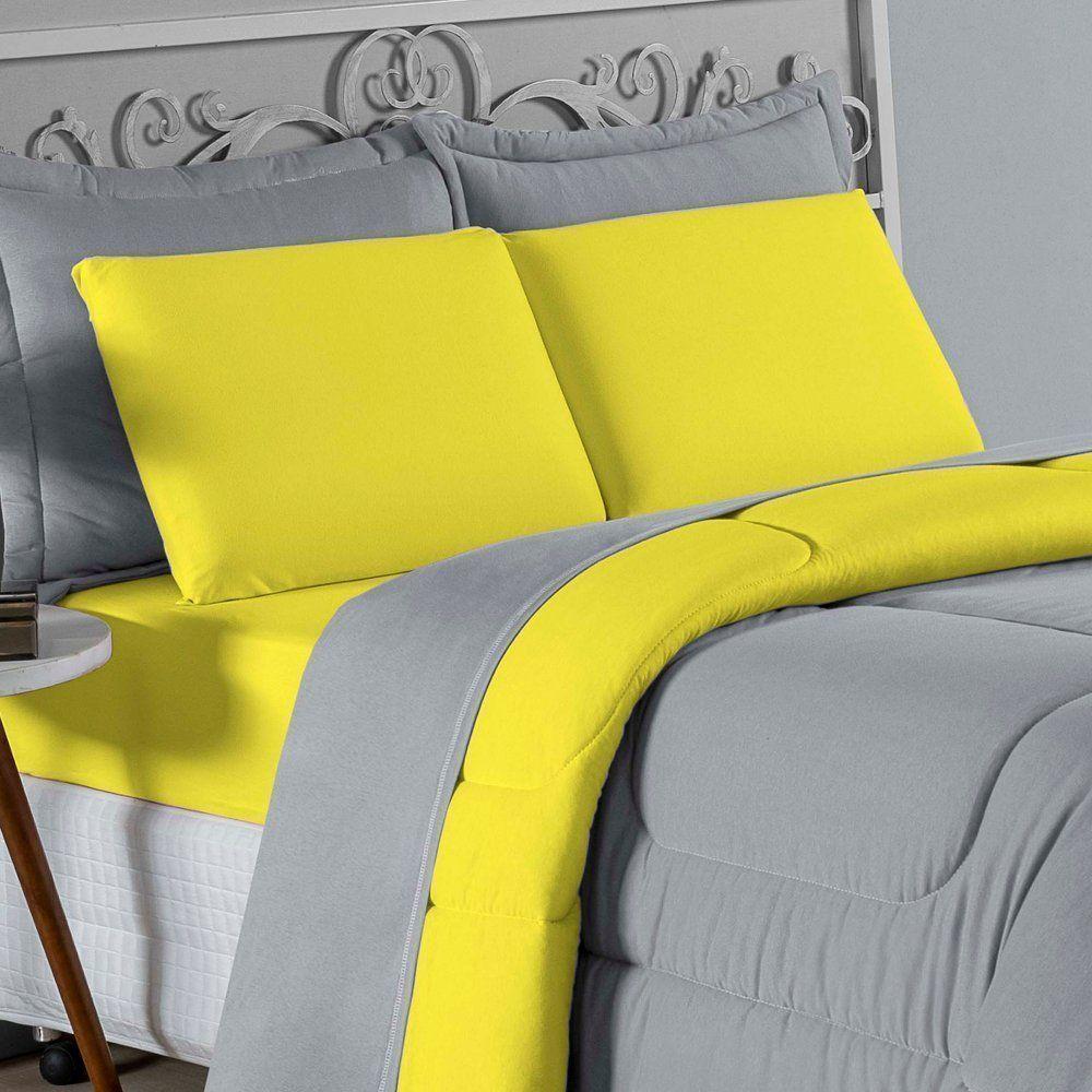 Kit Edredom Dupla Face + Jogo De Lençol Casal Viúva Nobre 7 Peças Malha 100% Algodão - Cinza / Amarelo