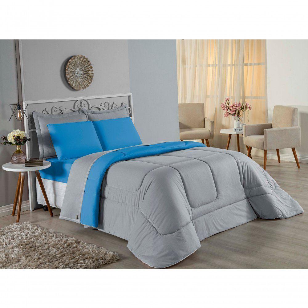 Kit Edredom Dupla Face + Jogo De Lençol Casal Viúva Nobre 7 Peças Malha 100% Algodão - Cinza / Turquesa