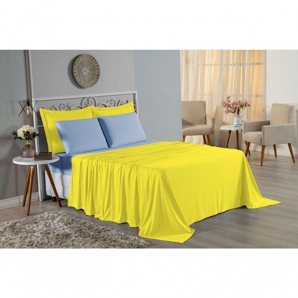 Jogo De Cama Casal Nobre 4 Peças Lençol Com Elástico De 30cm De Altura Malha 100% Algodão - Amarelo / Azul-bebê
