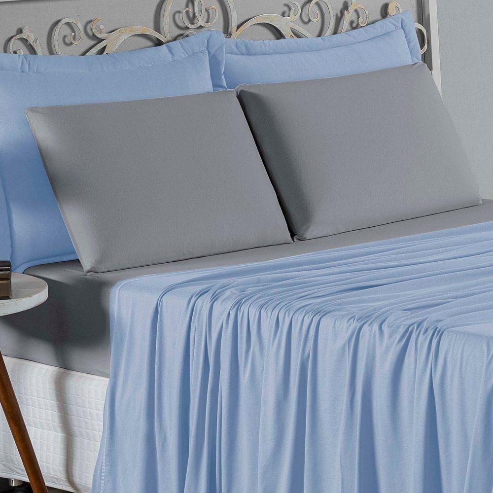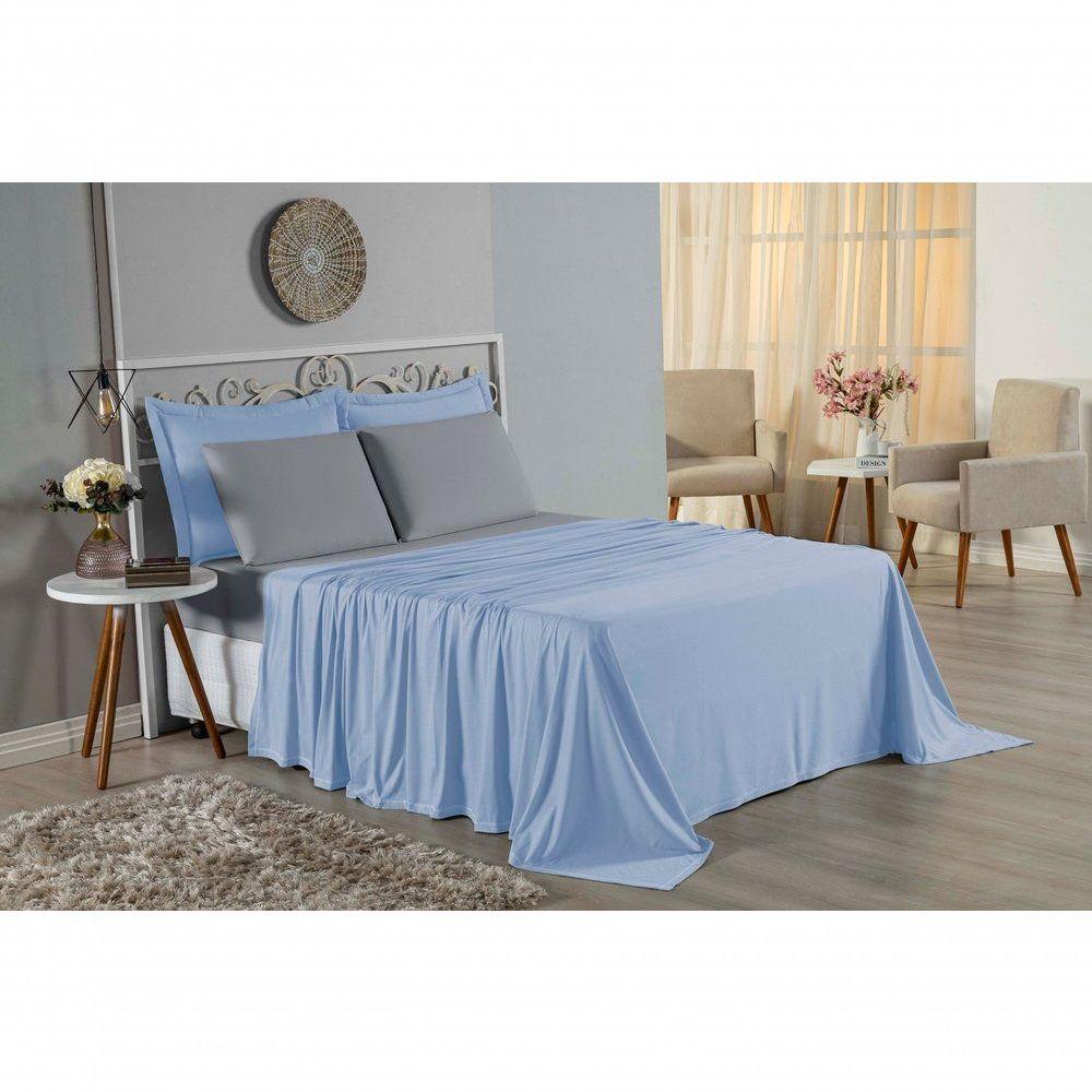 Jogo De Cama Casal Nobre 4 Peças Lençol Com Elástico De 30cm De Altura Malha 100% Algodão - Azul-bebê / Cinza
