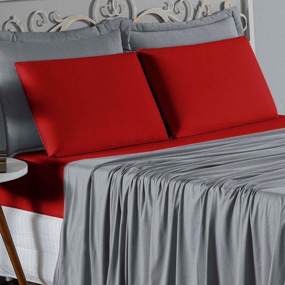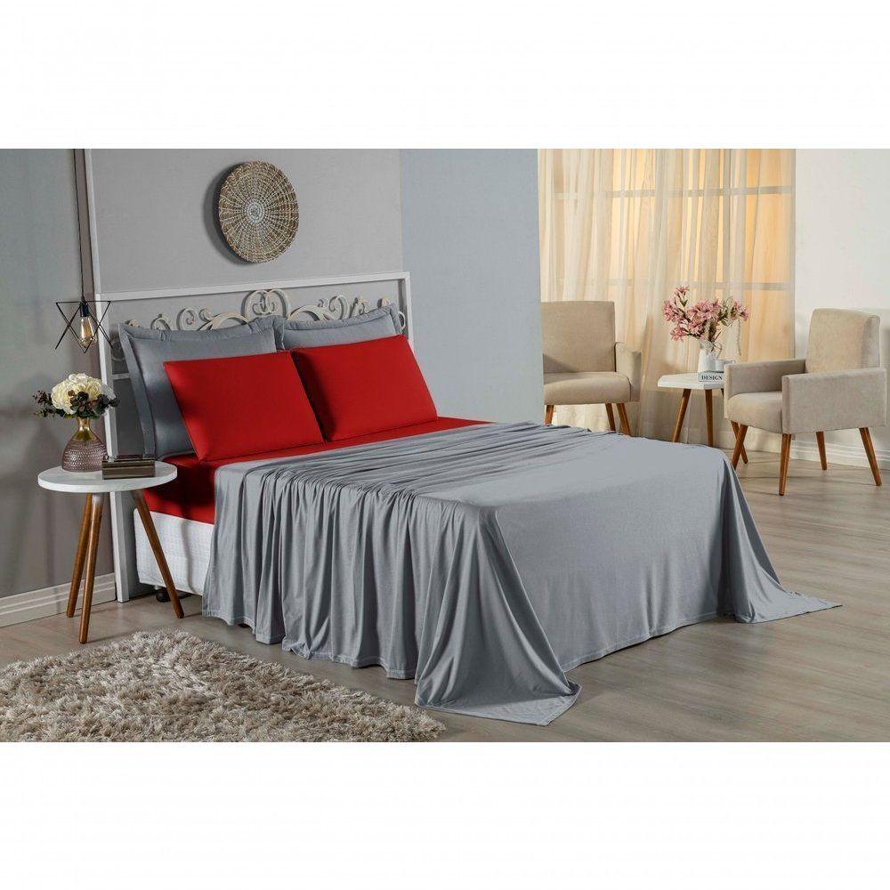 Jogo De Cama Casal Nobre 4 Peças Lençol Com Elástico De 30cm De Altura Malha 100% Algodão - Cinza / Vermelho