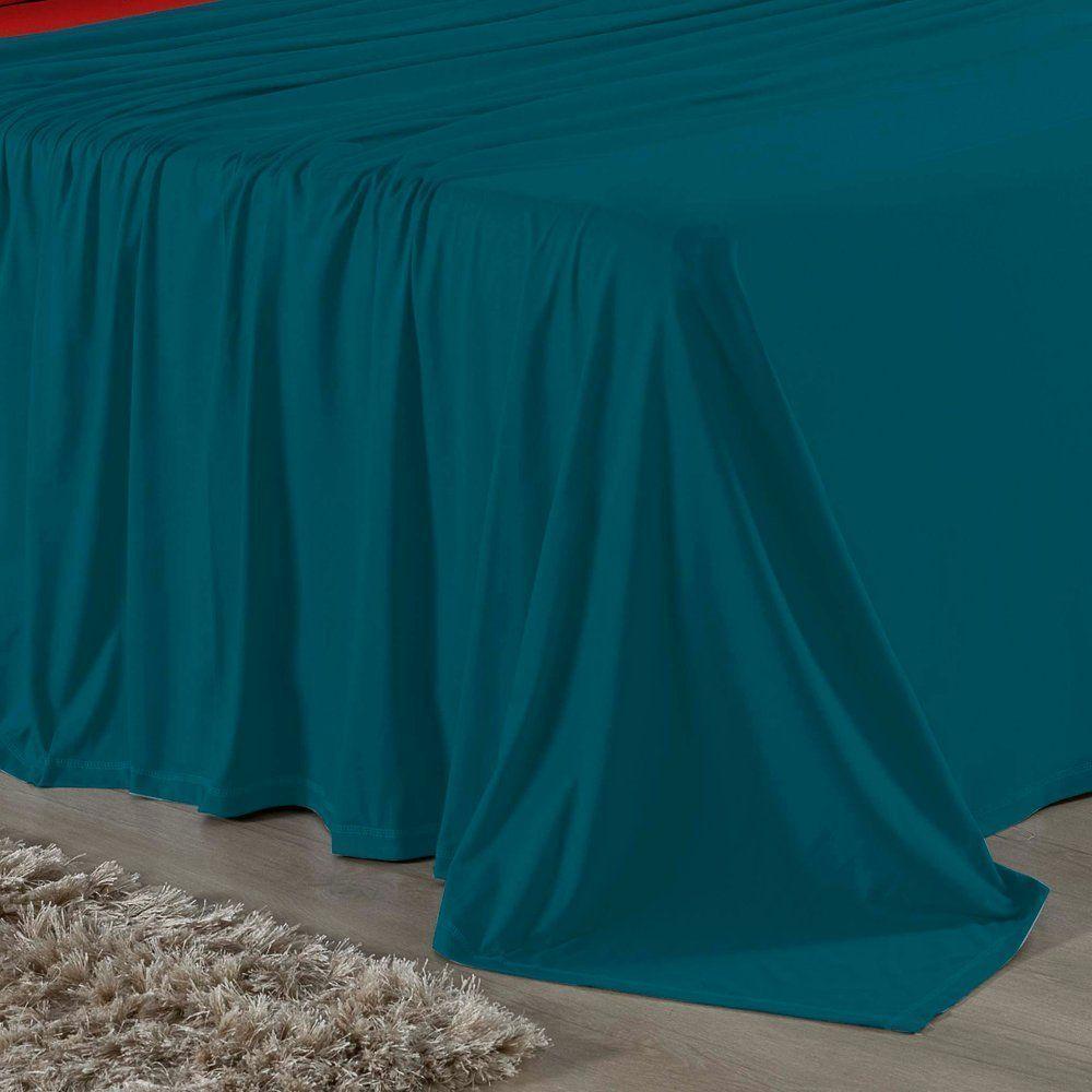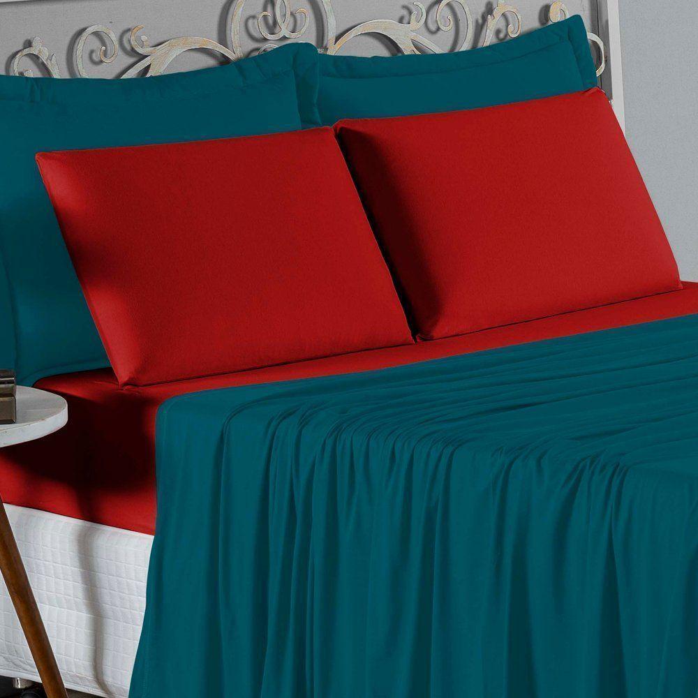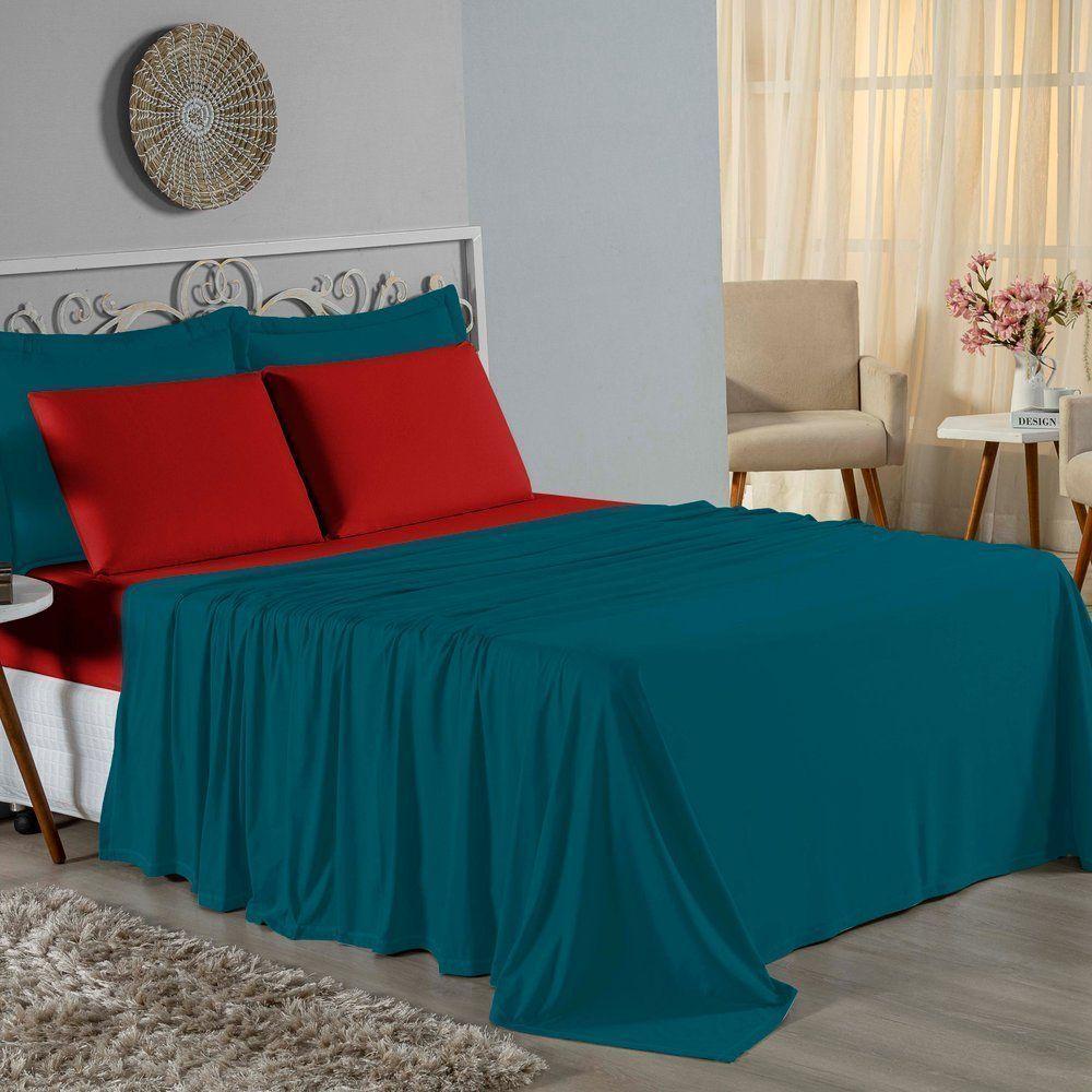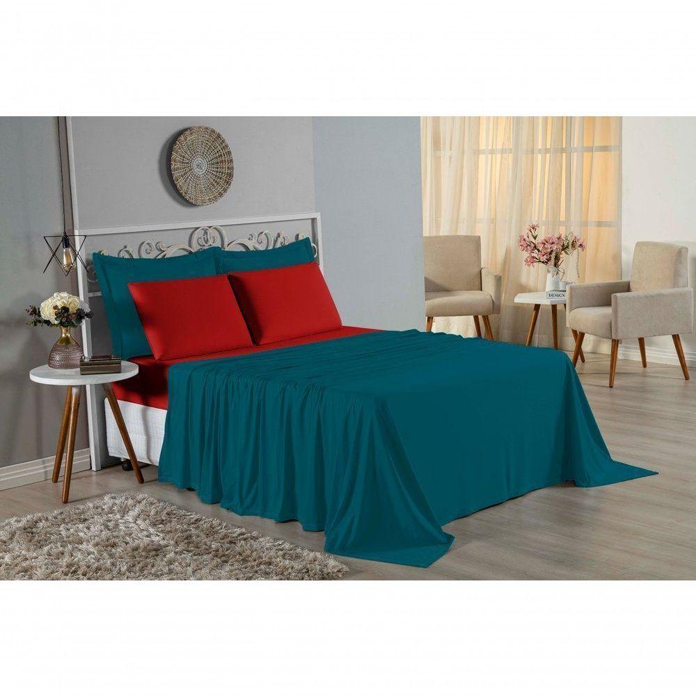 Jogo De Cama Casal Nobre 4 Peças Lençol Com Elástico De 30cm De Altura Malha 100% Algodão - Petróleo / Vermelho