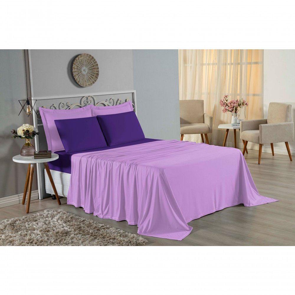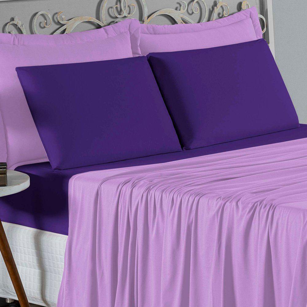 Jogo De Cama King Nobre 4 Peças Lençol Com Elástico De 30cm De Altura Malha 100% Algodão - Lilás / Roxo