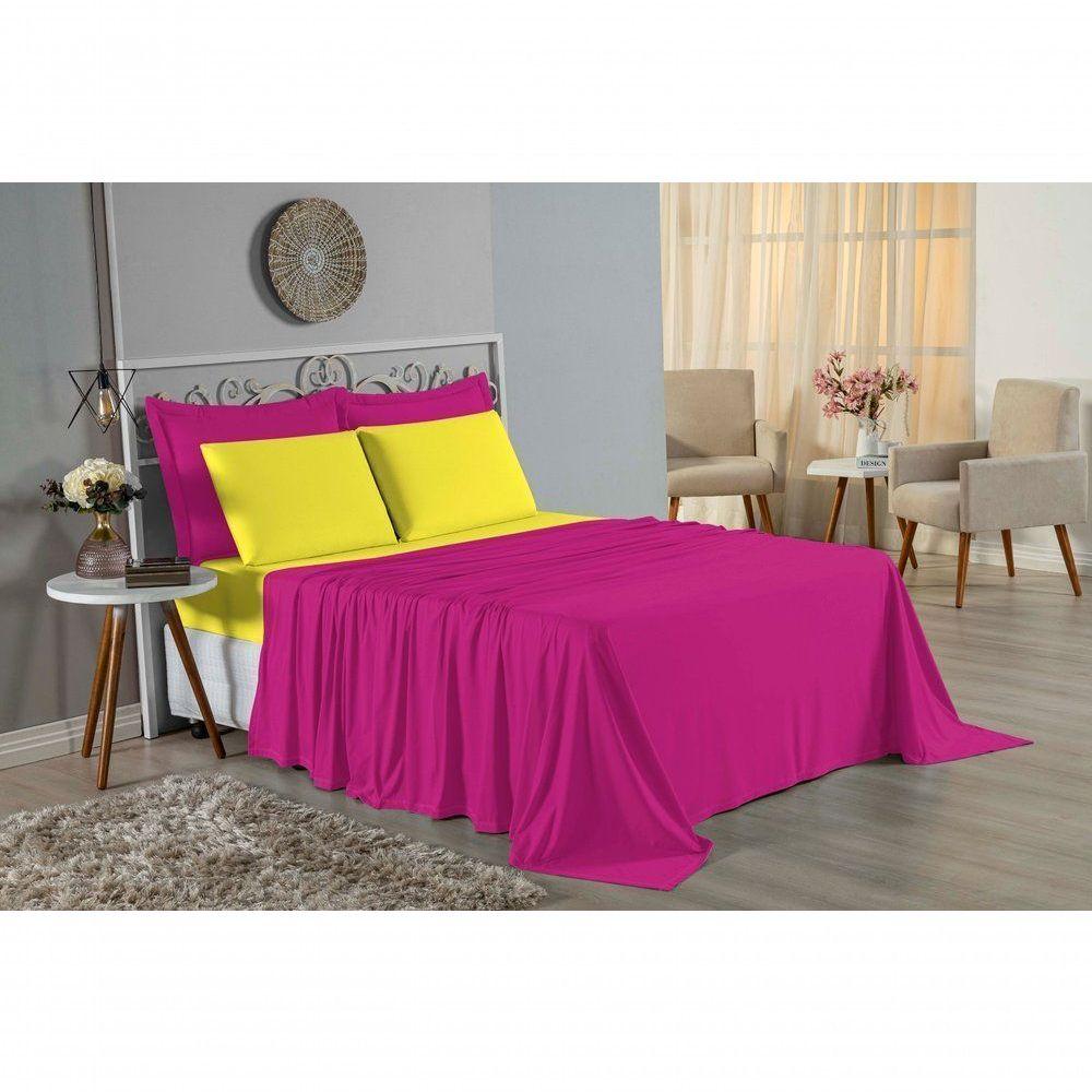 Jogo De Cama King Nobre 4 Peças Lençol Com Elástico De 30cm De Altura Malha 100% Algodão - Pink / Amarelo