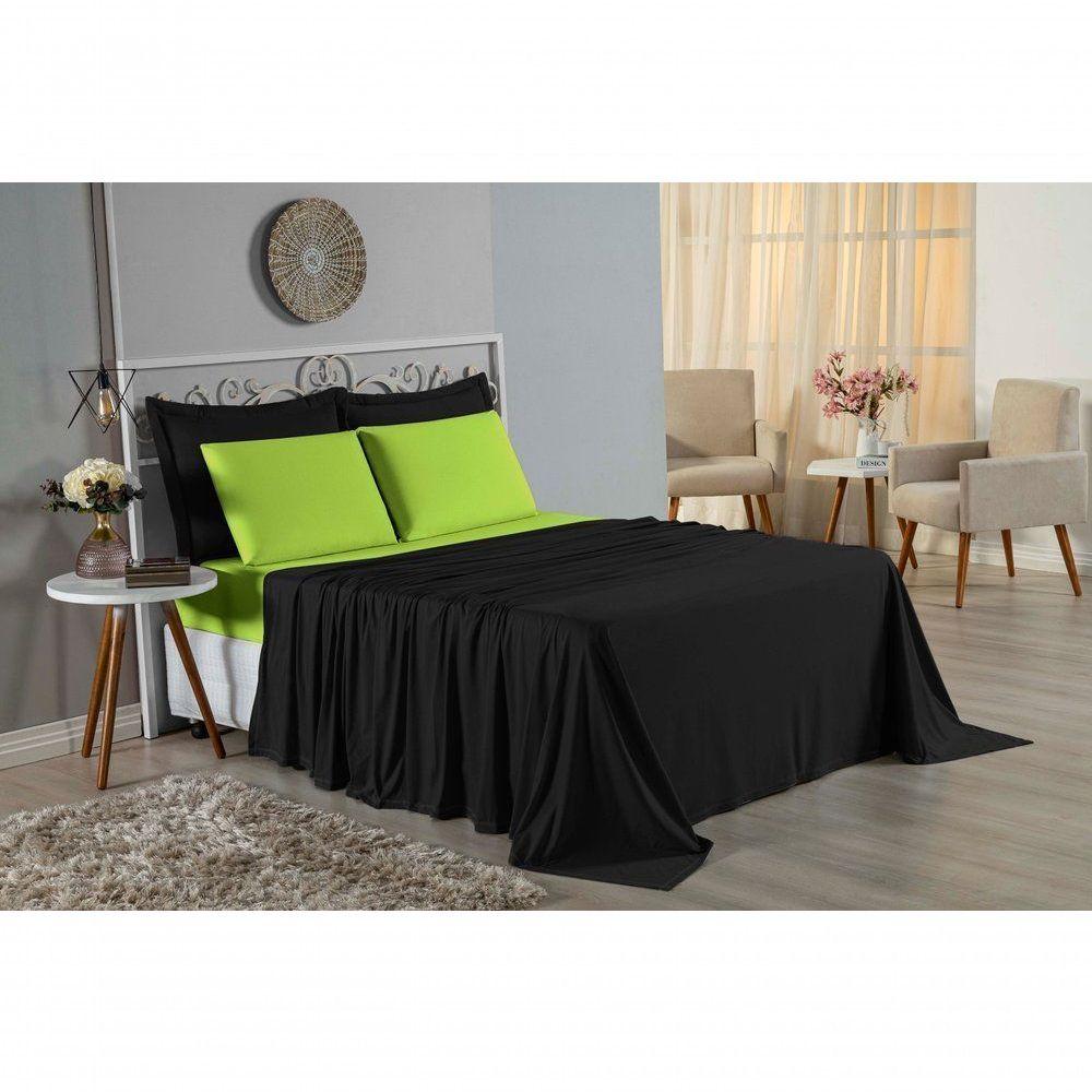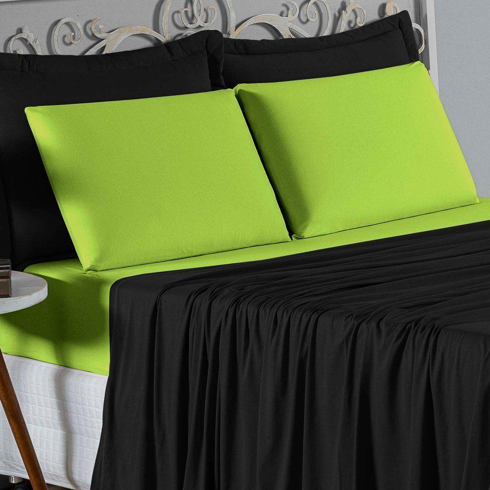 Jogo De Cama King Nobre 4 Peças Lençol Com Elástico De 30cm De Altura Malha 100% Algodão - Preto / Pistache