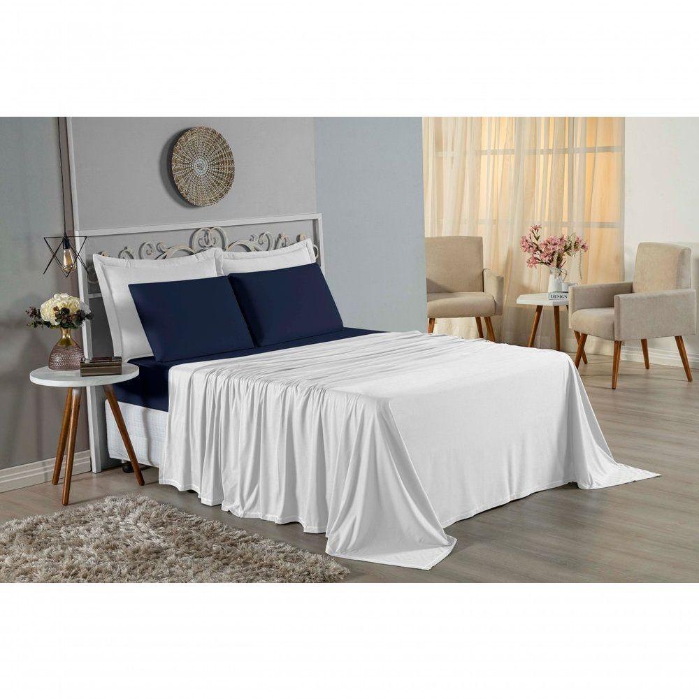 Jogo De Cama King Nobre 4 Peças Lençol Com Elástico De 30cm De Altura Malha 100% Algodão - Branco / Azul-marinhoComplete a grandiosidade da sua cama com o Jogo de Cama King Nobre 4 Peças. Espaço, conforto e a pureza do algodão reunidos em um enxoval magnífico.Por que este Jogo de Cama é a escolha perfeita?- Máximo Conforto King: Desenvolvido para camas amplas, com um lençol de cima gigante (2,50m x 2,90m) que proporciona cobertura total e caimento impecável.- Puro Algodão: A composição 100% natural oferece um toque sedoso e fresco, essencial para um descanso reparador.- Fixação Ideal: O lençol de baixo abraça colchões King de até 30cm de altura, mantendo a cama sempre organizada.- Jogo Completo: Tudo o que você precisa para vestir a cama com elegância e funcionalidade em um único pacote.Produto composto por (Total 04 Peças):01 Lençol de Cima (Virol): 2,50m x 2,90m01 Lençol de Baixo com Elástico: 1,93m x 2,03m x 30cm02 Fronhas: 70cm x 50cmComposição:Tecido: Malha 100% Algodão - Fio 30/1 Penteado