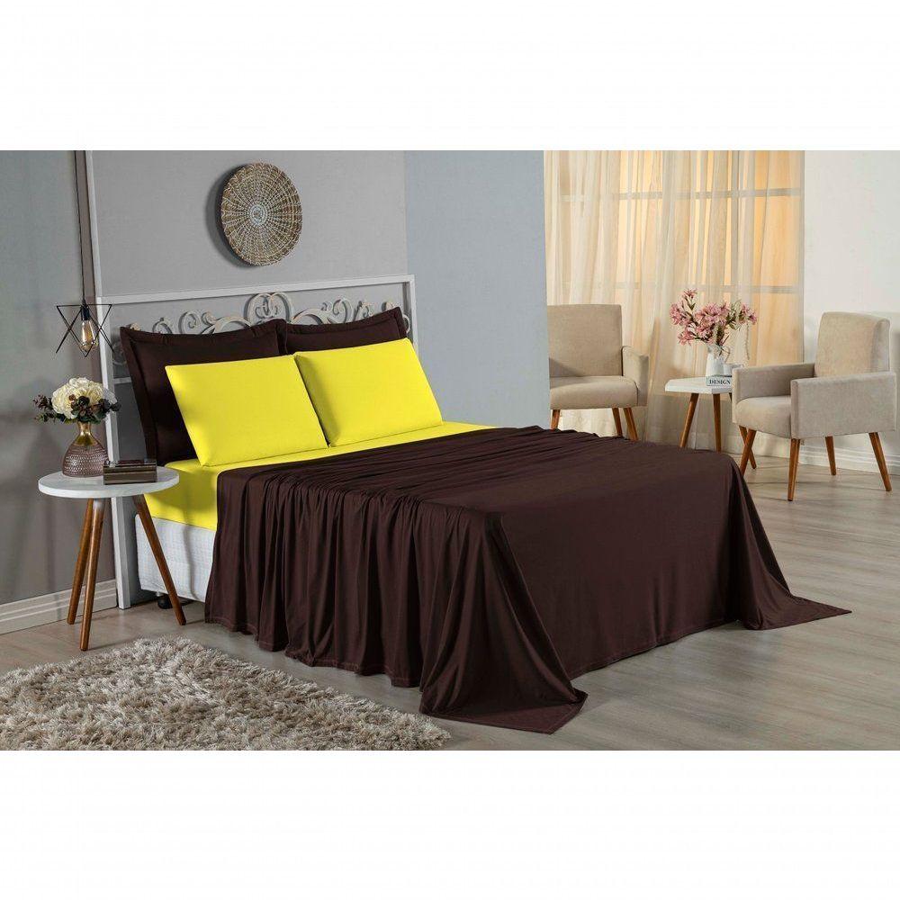 Jogo De Cama Queen Nobre 4 Peças Lençol Com Elástico De 30cm De Altura Malha 100% Algodão - Marrom / Amarelo