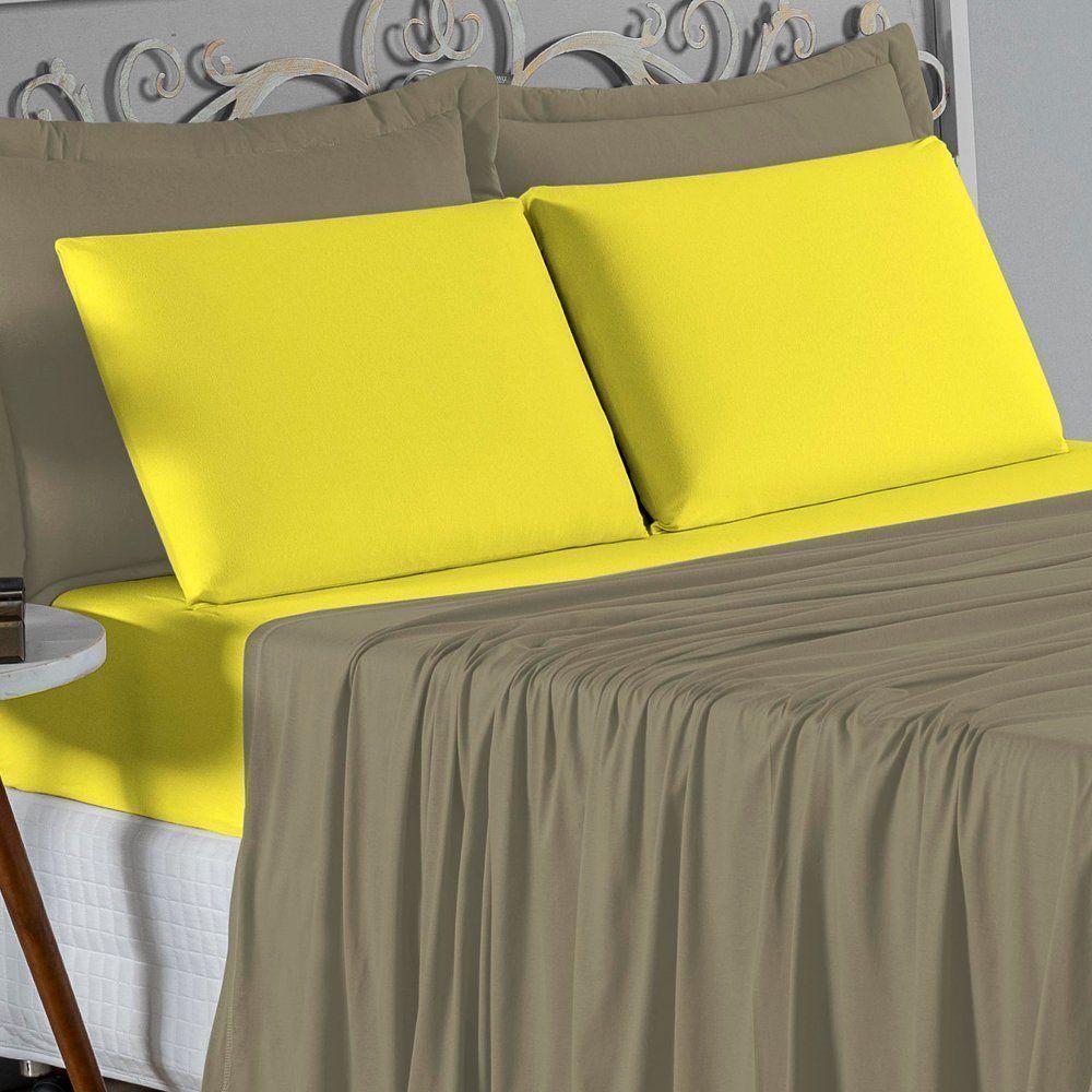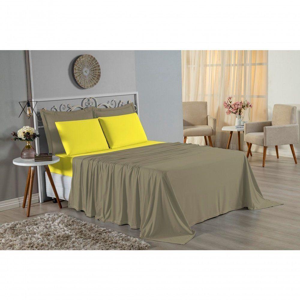 Jogo De Cama Queen Nobre 4 Peças Lençol Com Elástico De 30cm De Altura Malha 100% Algodão - Avelã / Amarelo