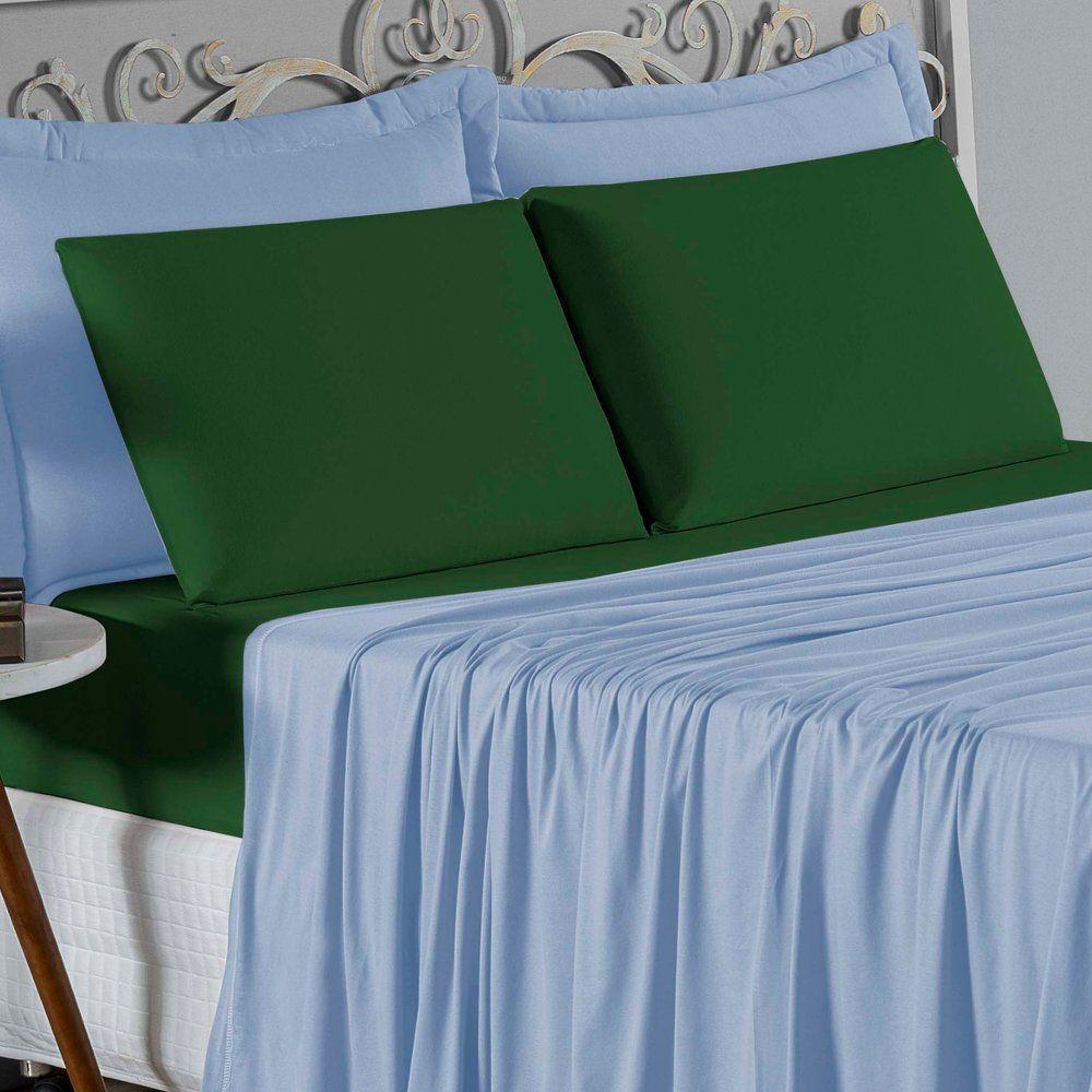 Jogo De Cama Queen Nobre 4 Peças Lençol Com Elástico De 30cm De Altura Malha 100% Algodão - Azul-bebê / Verde-bandeira
